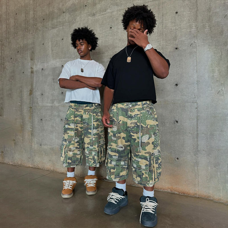 DiZNEW Custom Trending Short Jeans Men 2025 New Arrivals Streetwear Casual Fashion Baggy Camo Jorts Pants with Rhinestones