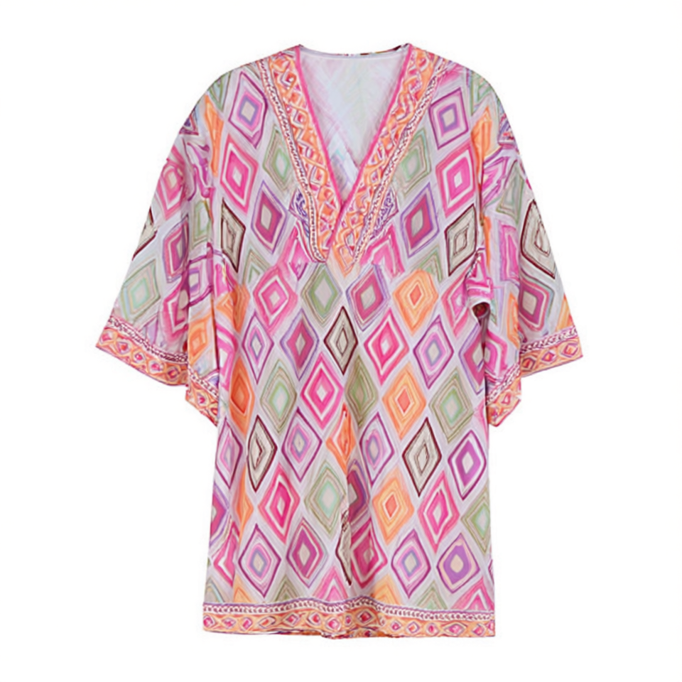 Camicia da spiaggia a maniche corte con motivo a rombi 88x54cm, scollo a V, copricostume