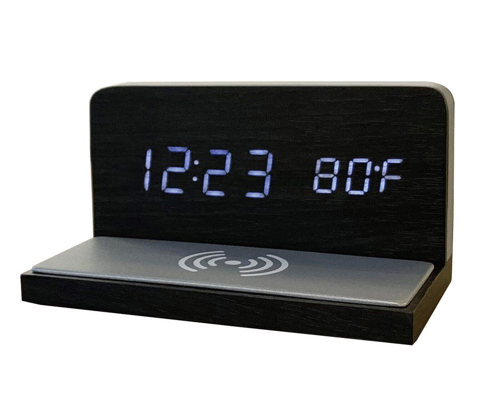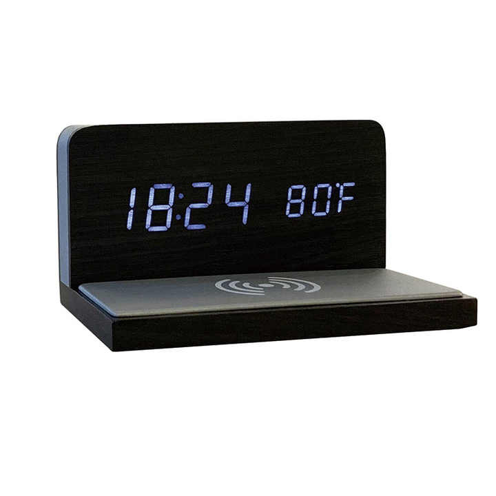 Orologio da tavolo con cornice in bambù digitale ricarica Wireless e visualizzazione del calendario della temperatura controllo del suono sveglia in legno a LED