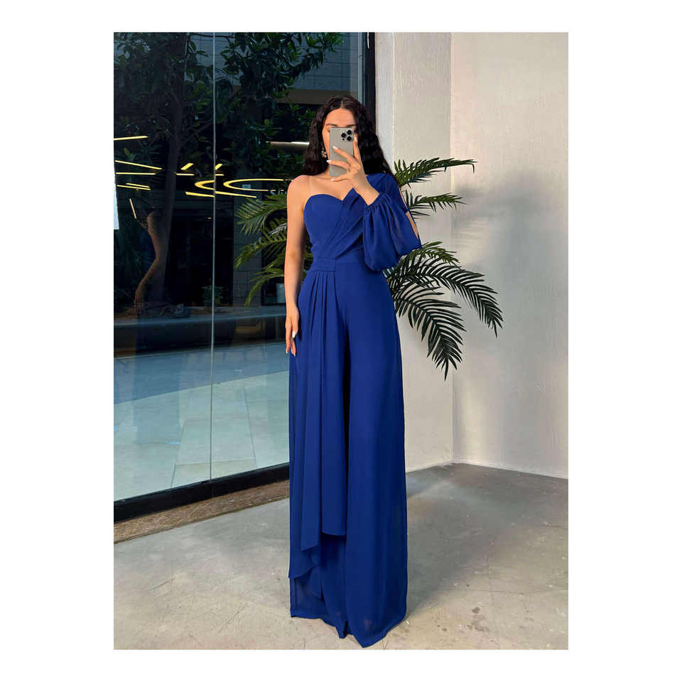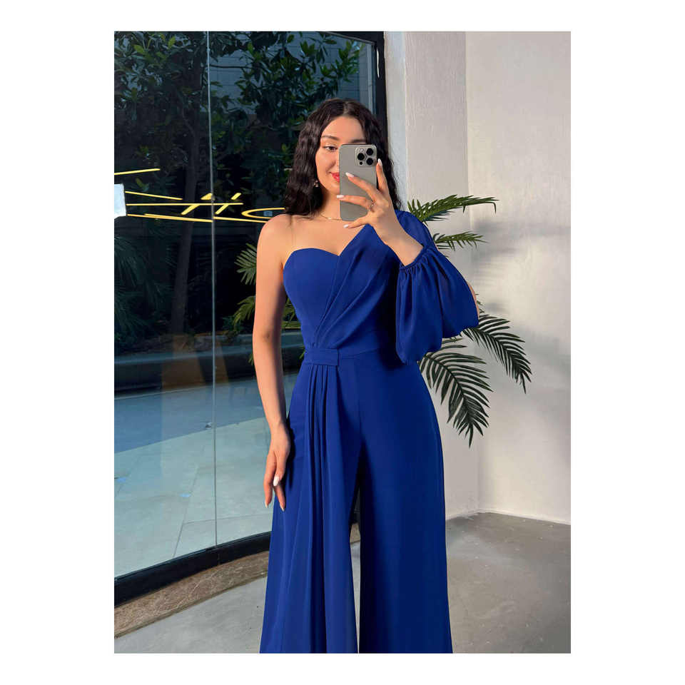 Diora Tek Kol ifon Tulum-Saks Mavi Women's Jumpsuit Playful and Stylish Navy Blue Design