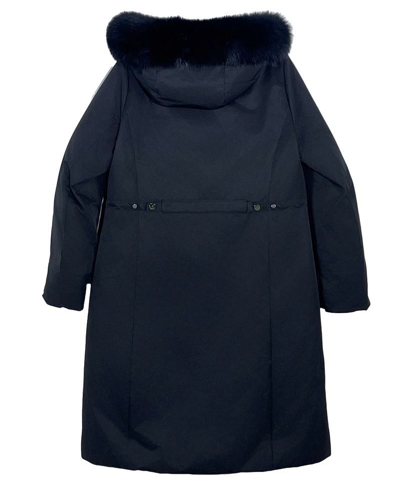 Feature:Long warm slim-fit coat with faux rabbit fur hood