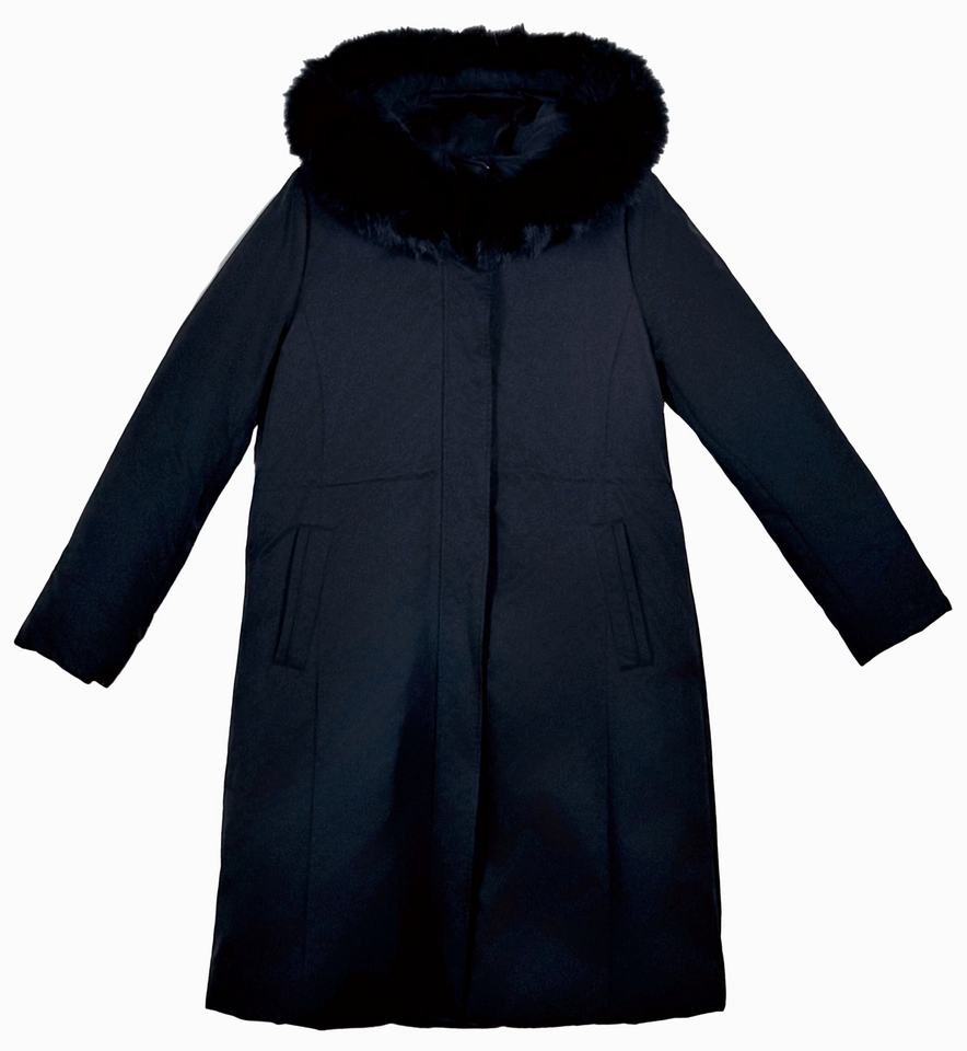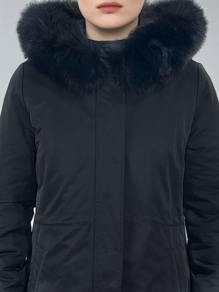 Long warm slim-fit coat with faux rabbit fur hood
