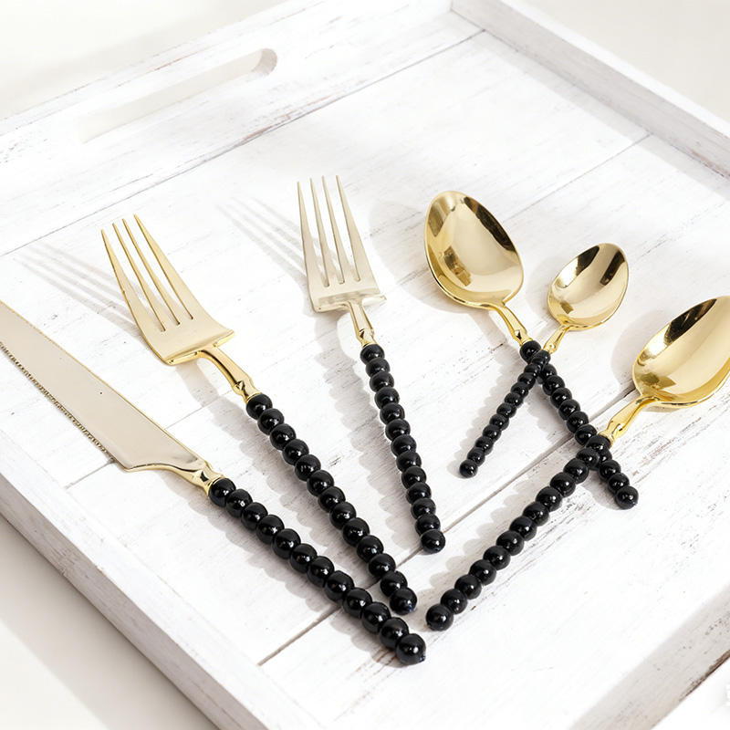 Set di Posate Monouso da Campeggio con Manico Nero, Coltello Forchetta Cucchiaio in Plastica con Punta Dorata, Servizio Logo ODM Disponibile