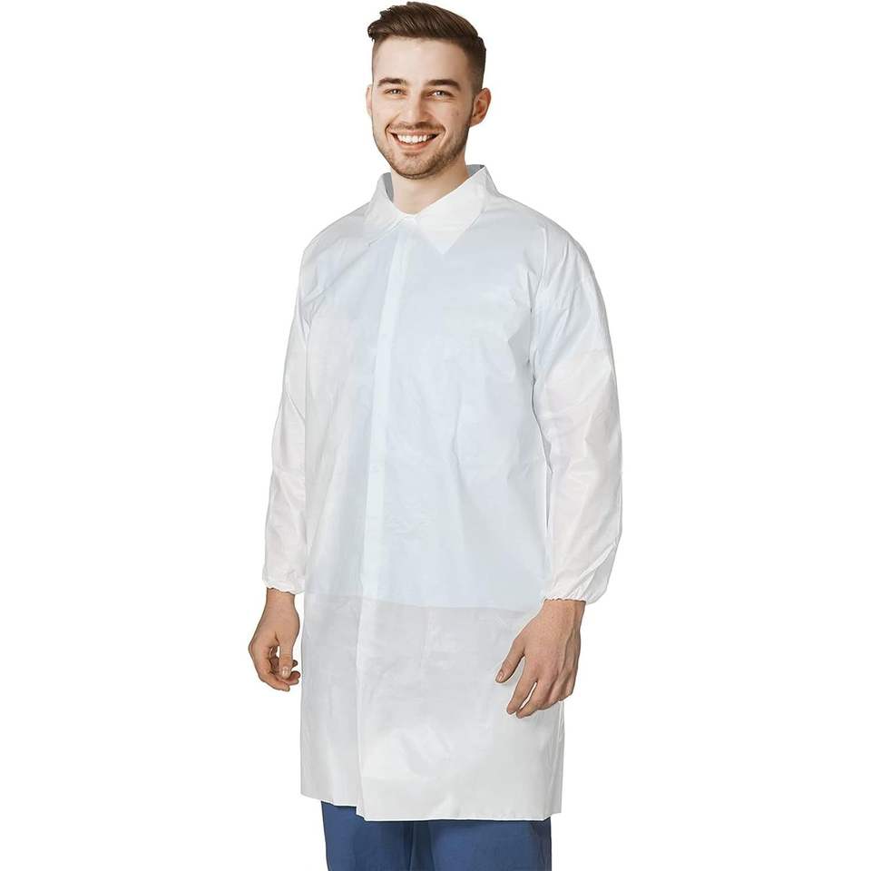 Camice da laboratorio Unisex per adulti monouso 43 \ "X 55 \" 40 Gsm bianco elasticizzato polsi con bottoni a maniche lunghe senza tasche Non Sterile