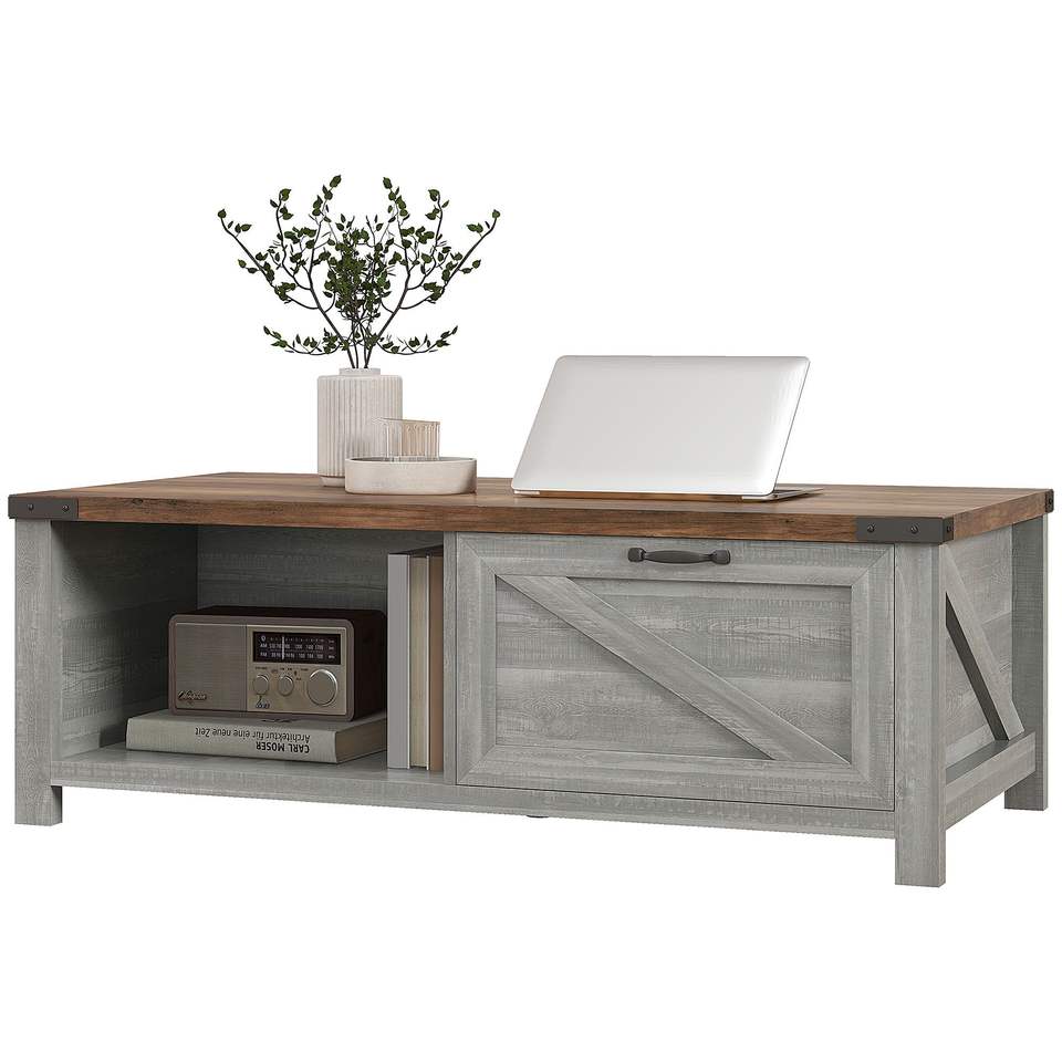 Tavolino da Caffè in Stile Rustico Grigio Invecchiato con Cassetto Portaoggetti e Ripiano Aperto per Soggiorno