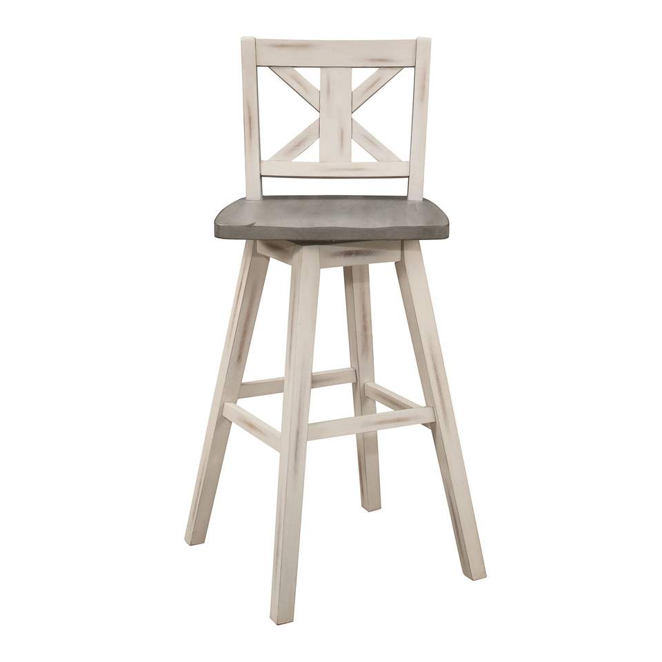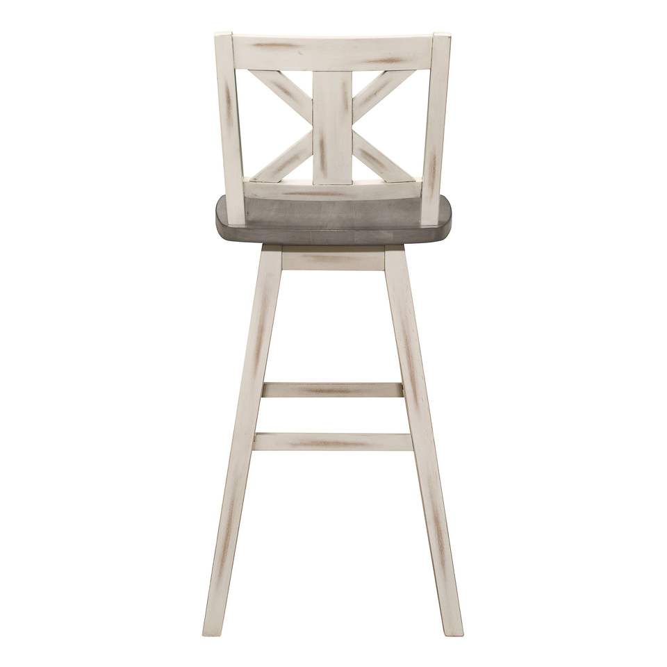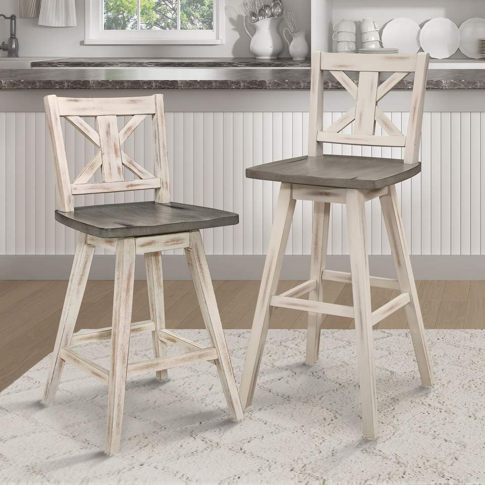 Set di 2 sedie girevoli da bar alte grigio-bianche effetto invecchiato, sgabelli da bar con schienale a X, rotazione a 360 gradi, mobili in legno massello di gomma