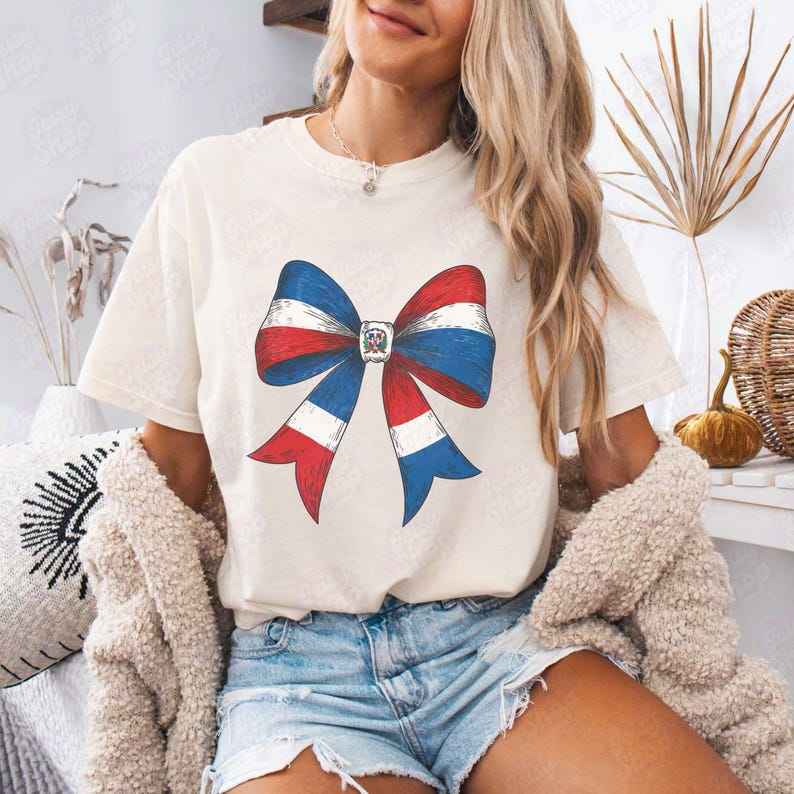 T-shirt con fiocco bandiera dominicana DR Comfort Colors, maglietta per il Mese della Memoria dell'Erbezza Ispanica, regalo per la famiglia latina, uso promozionale