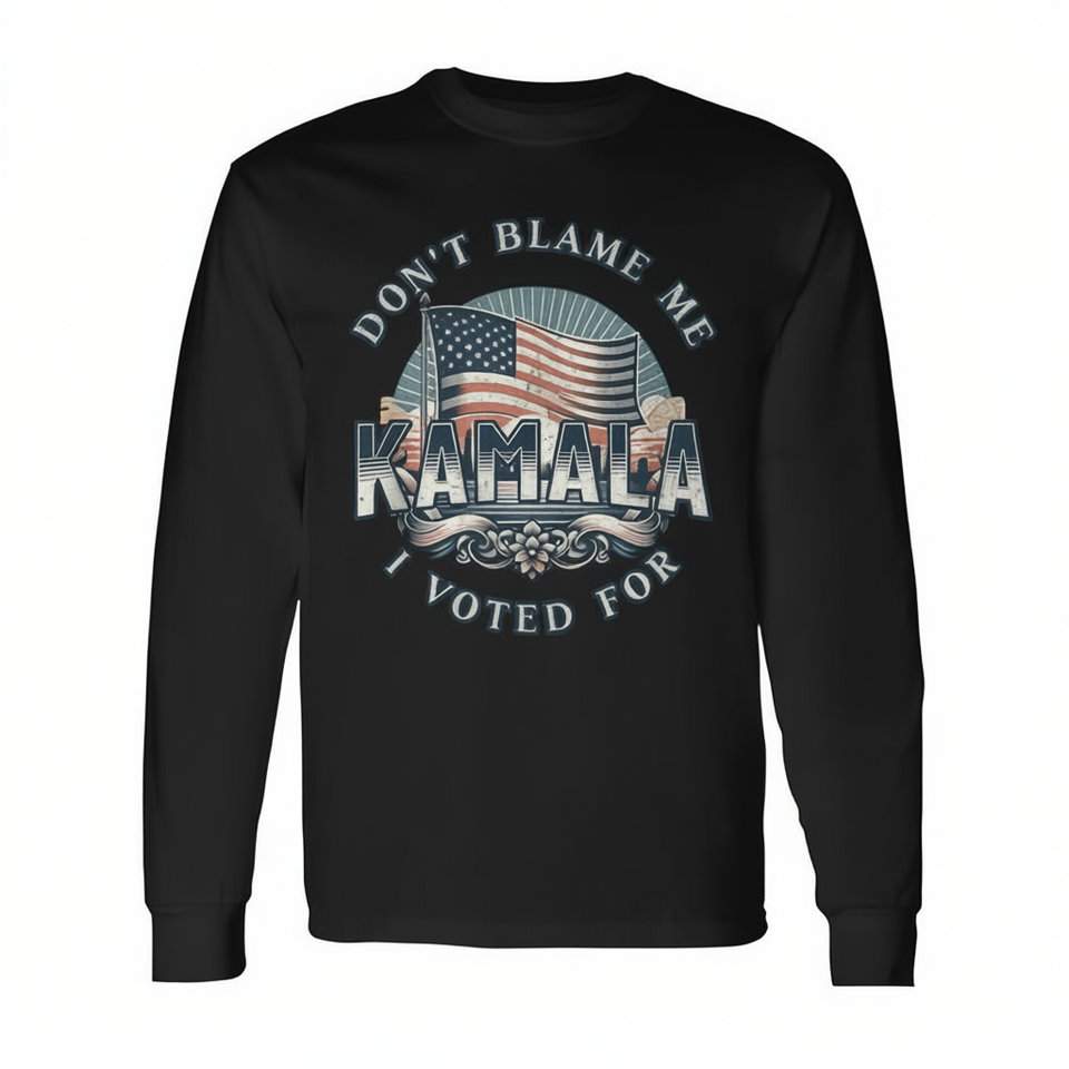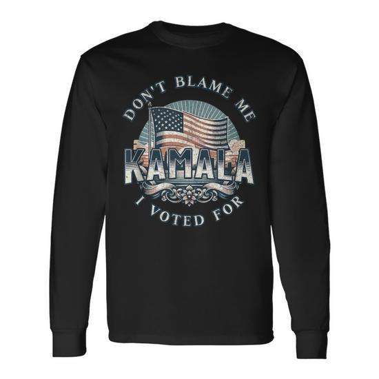 Non coltivare la colpa su di me, ho votato per Kamala. T-shirt a maniche lunghe con design vintage della bandiera americana.