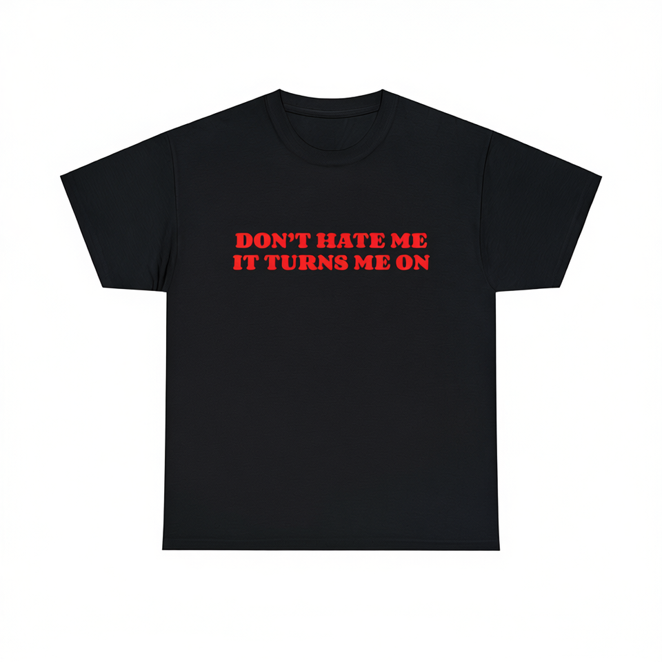 Don't Hate Me It Turns Me On T-Shirt Black Red Text Funny Ironic Meme Shirt Sarcastic Gag Gift