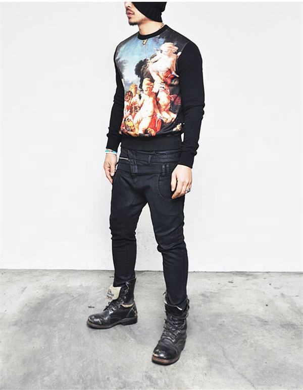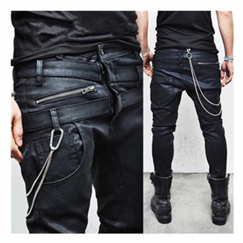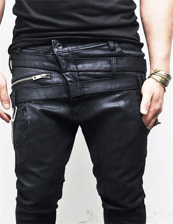 Product name:Double Belt Crotch Wax Coated Mens Black Skinny Denim Biker Jeans