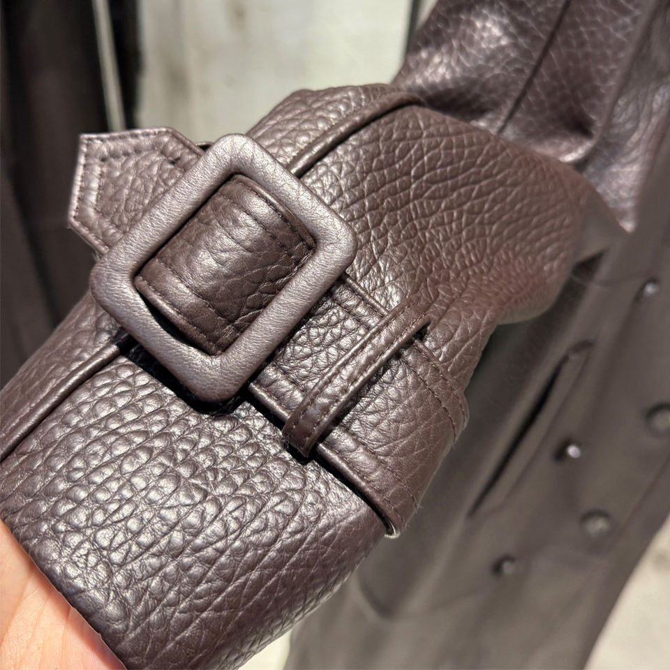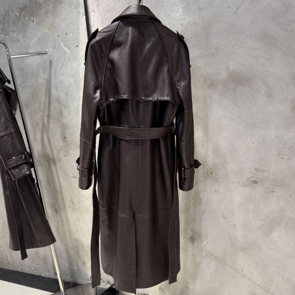 Trench Lungo Doppiopetto in Vera Pelle di Pecora Cappotto in Pelle Martellata Marrone