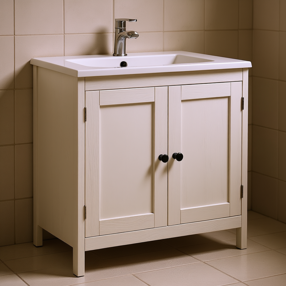 Mobile bagno a doppia anta, larghezza 36 pollici, in legno, sottolavabo, autoportante, finitura verniciata bianco antico