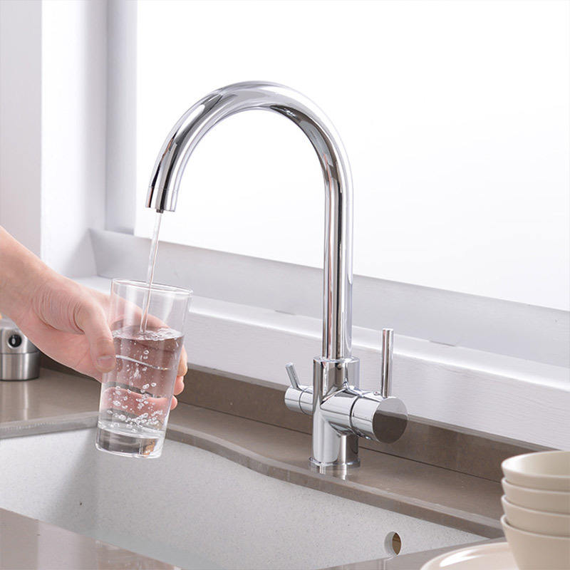 Rubinetto a Tre Vie con Doppia Maniglia in Ottone, Filtro per Acqua Potabile, Miscelatore a Tre Vie per Lavello da Cucina