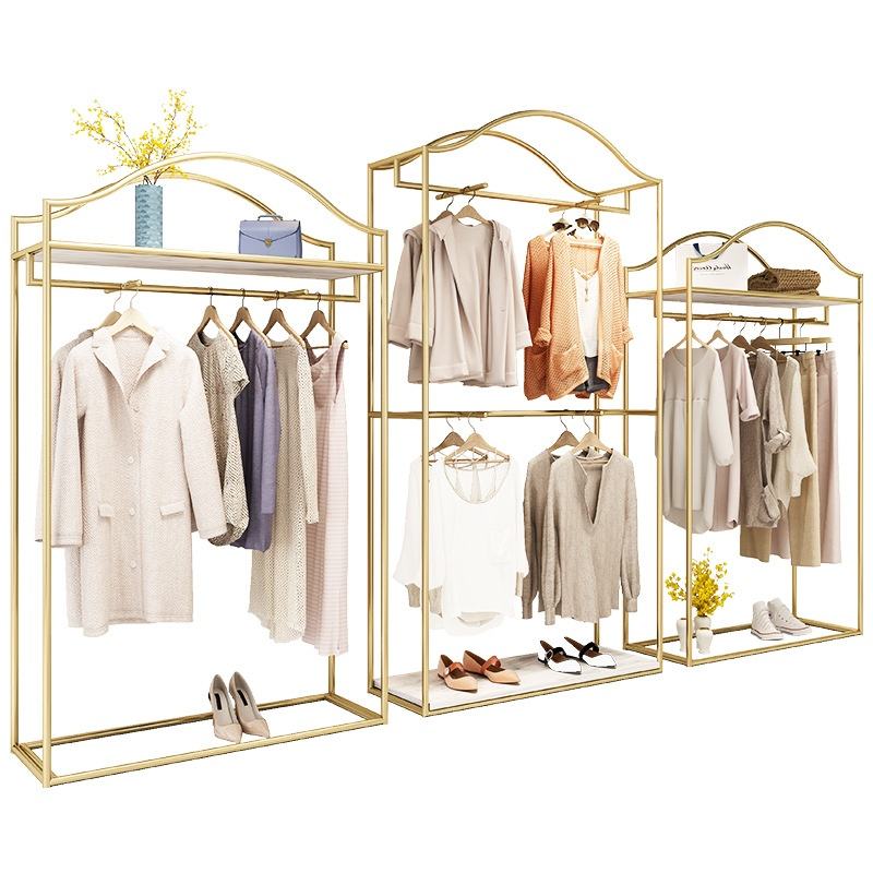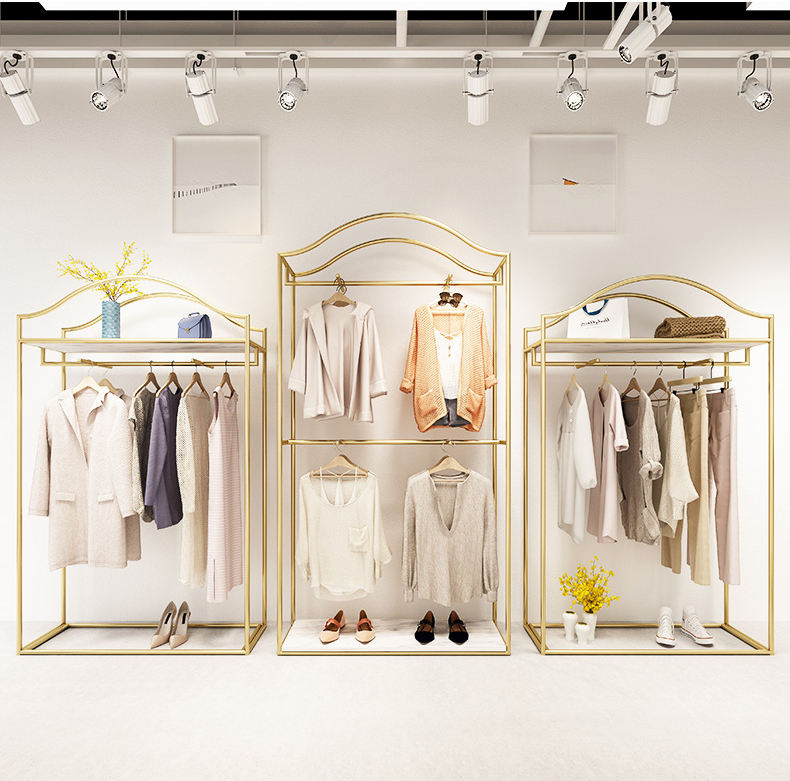 Espositore per Abbigliamento a Doppio Strato con Scaffali in Ferro Dorato e Asta Appendiabiti per Negozi di Abbigliamento Femminile