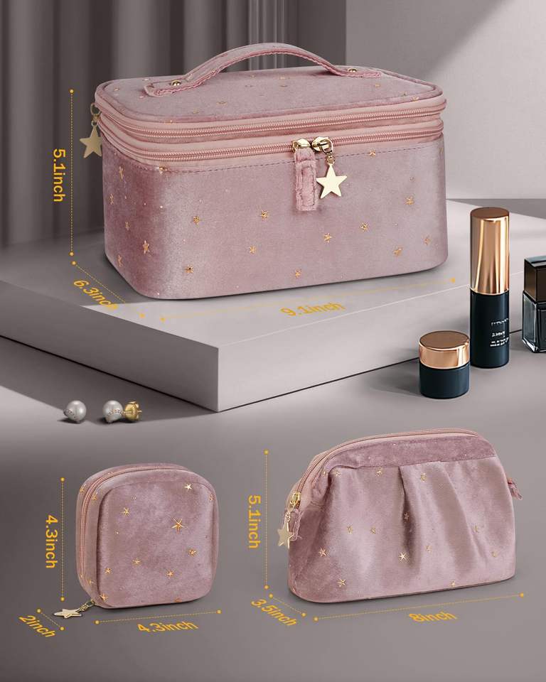 Beauty Case a Doppio Strato con Portagioie e Portapennelli / Borsa Organizer per Trucchi in Velluto Ricamato con Cerniera