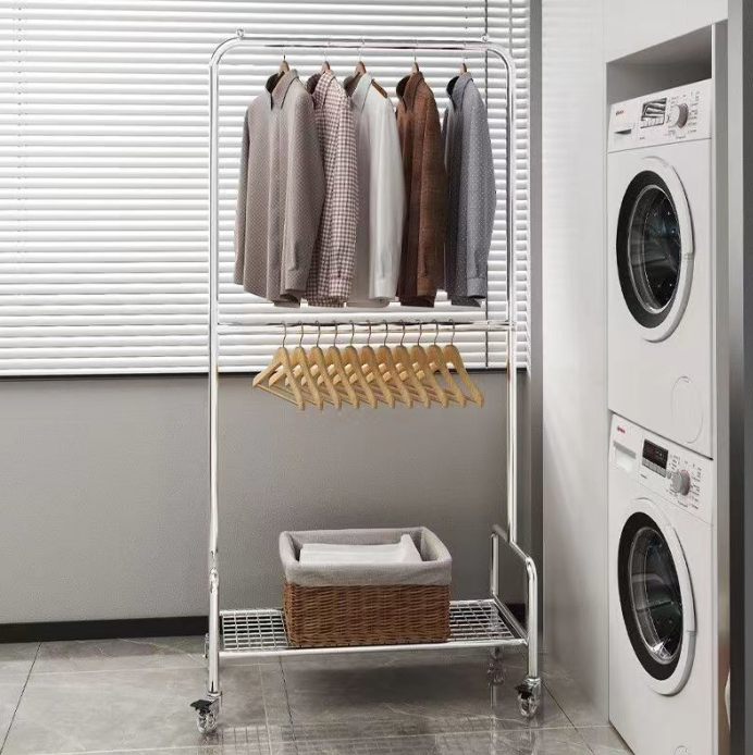 Espositore Mobile a Doppio Strato con Altezza Regolabile per Abbigliamento Maschile e Femminile nei Negozi di Abbigliamento, con Supporto da Terra
