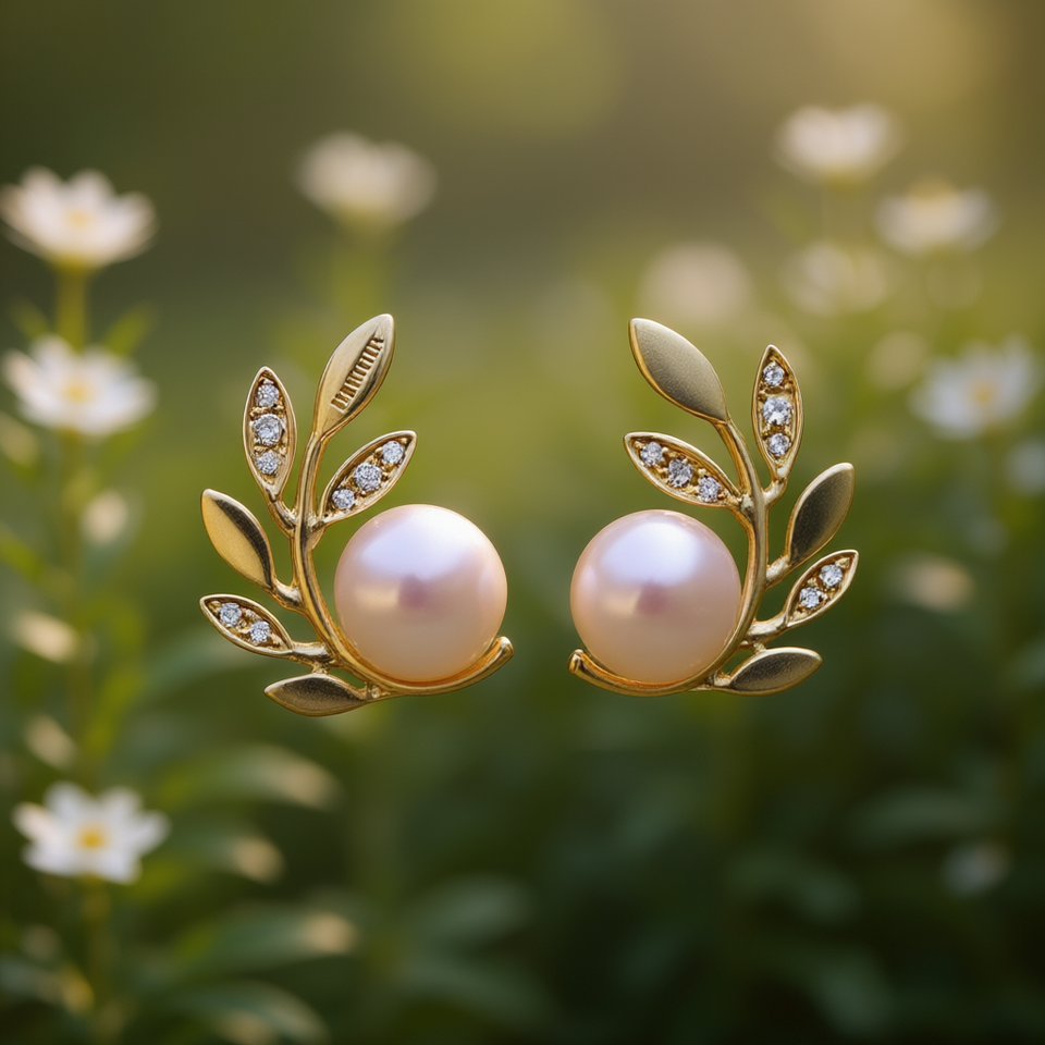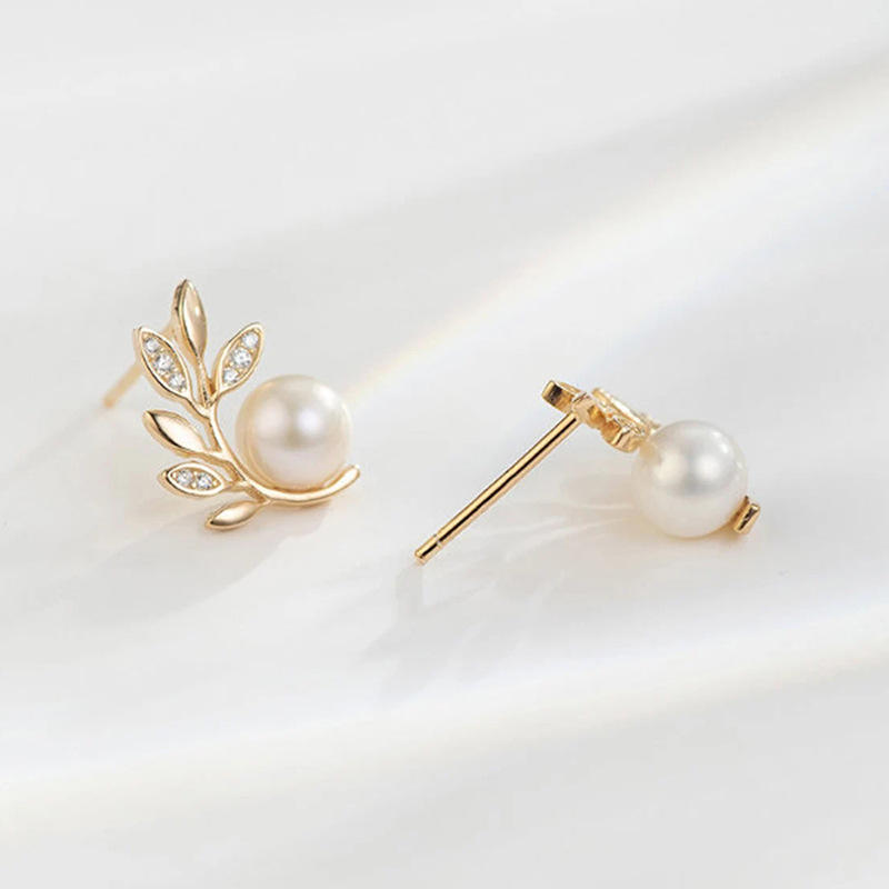Doutan Akoya Pearl Stud Earrings 18K Gold Plated Pink Round AAA Plant Design Wedding Classic Women Jewelry