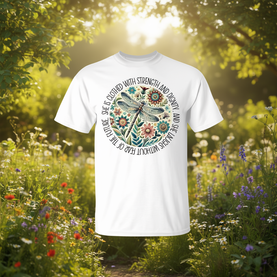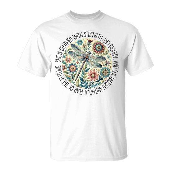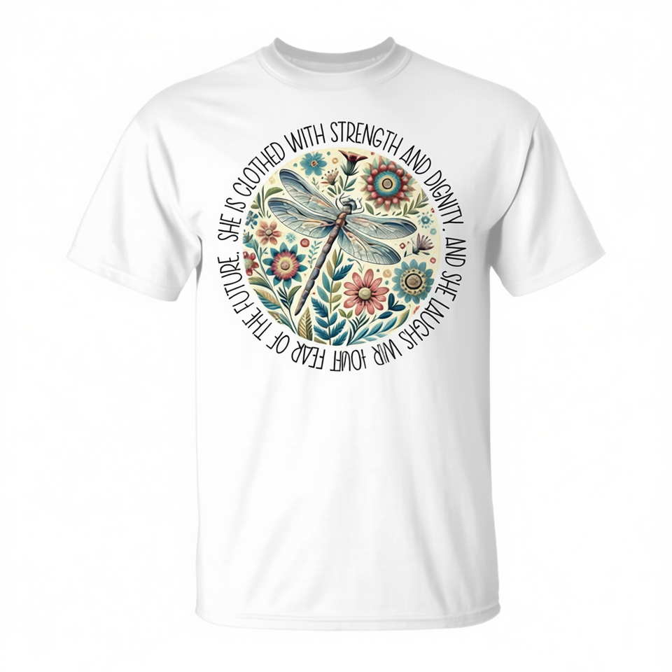 T-shirt promozionale a tema libellula 'Ella è vestita di forza e dignità'