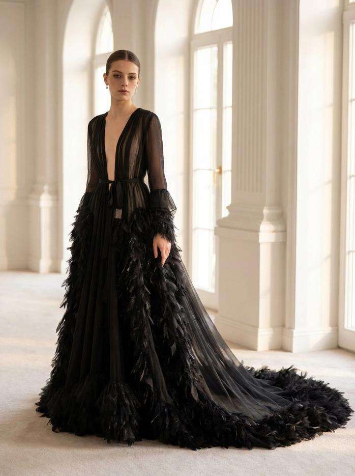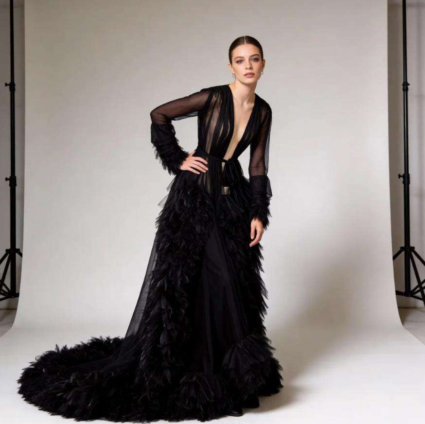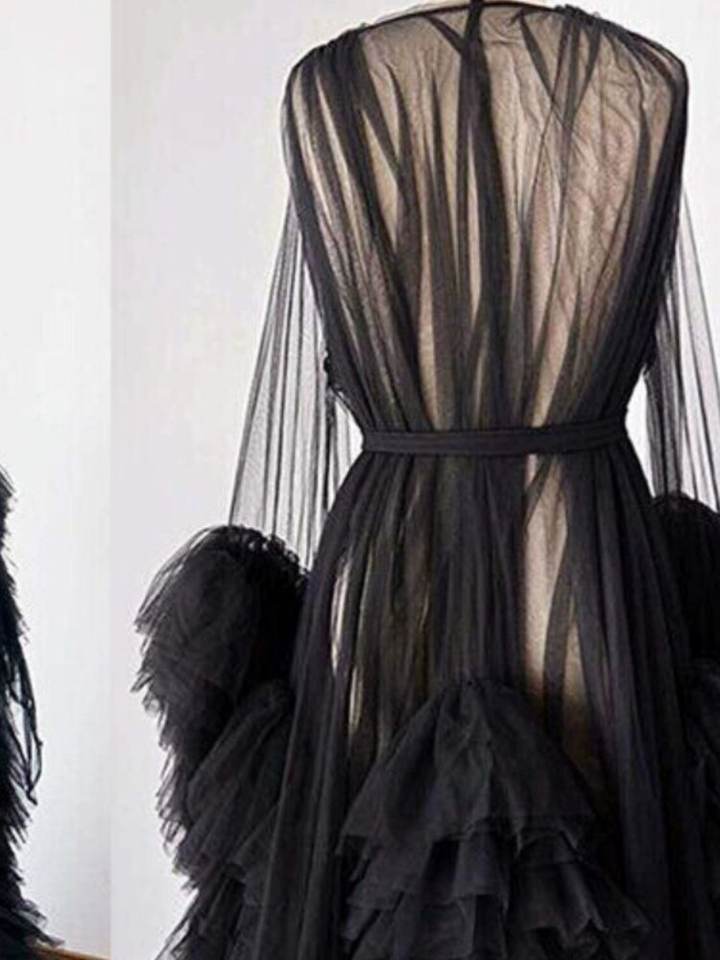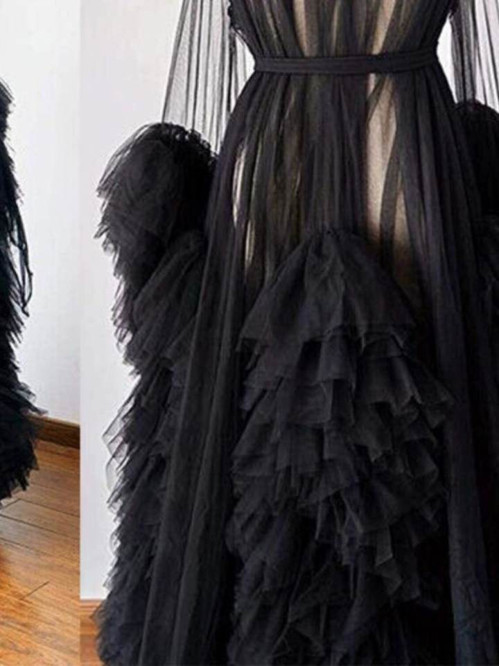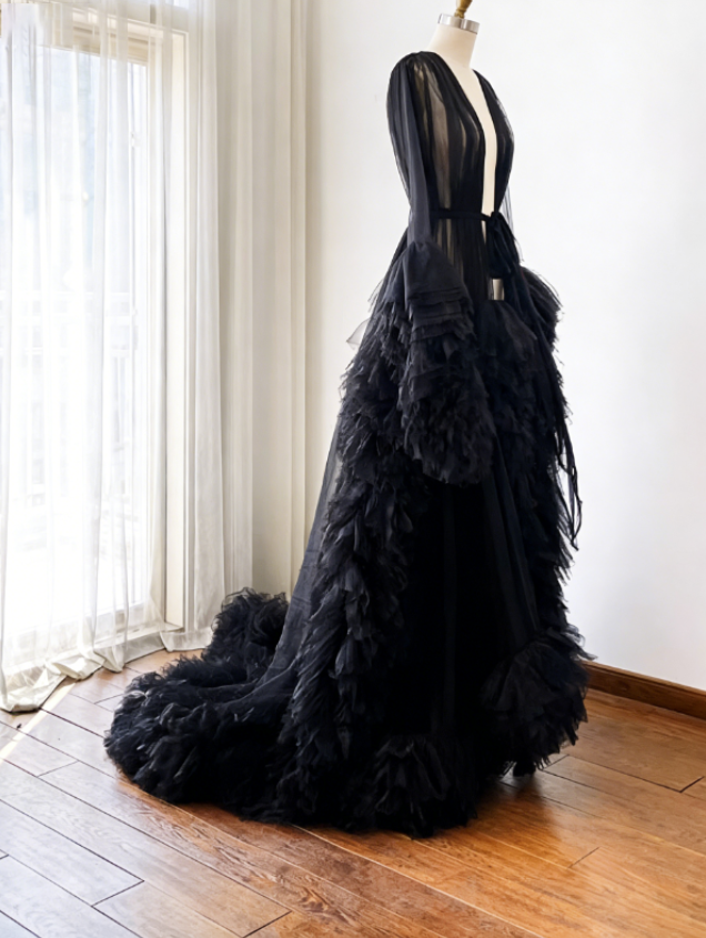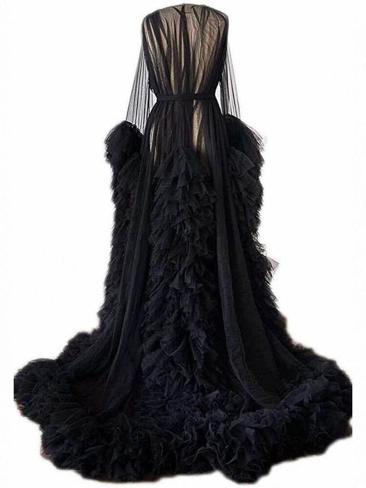 Abito da sposa romantico in tulle nero lungo con vita annodata, gonna a strati arricciata e strascico corto per la sposa