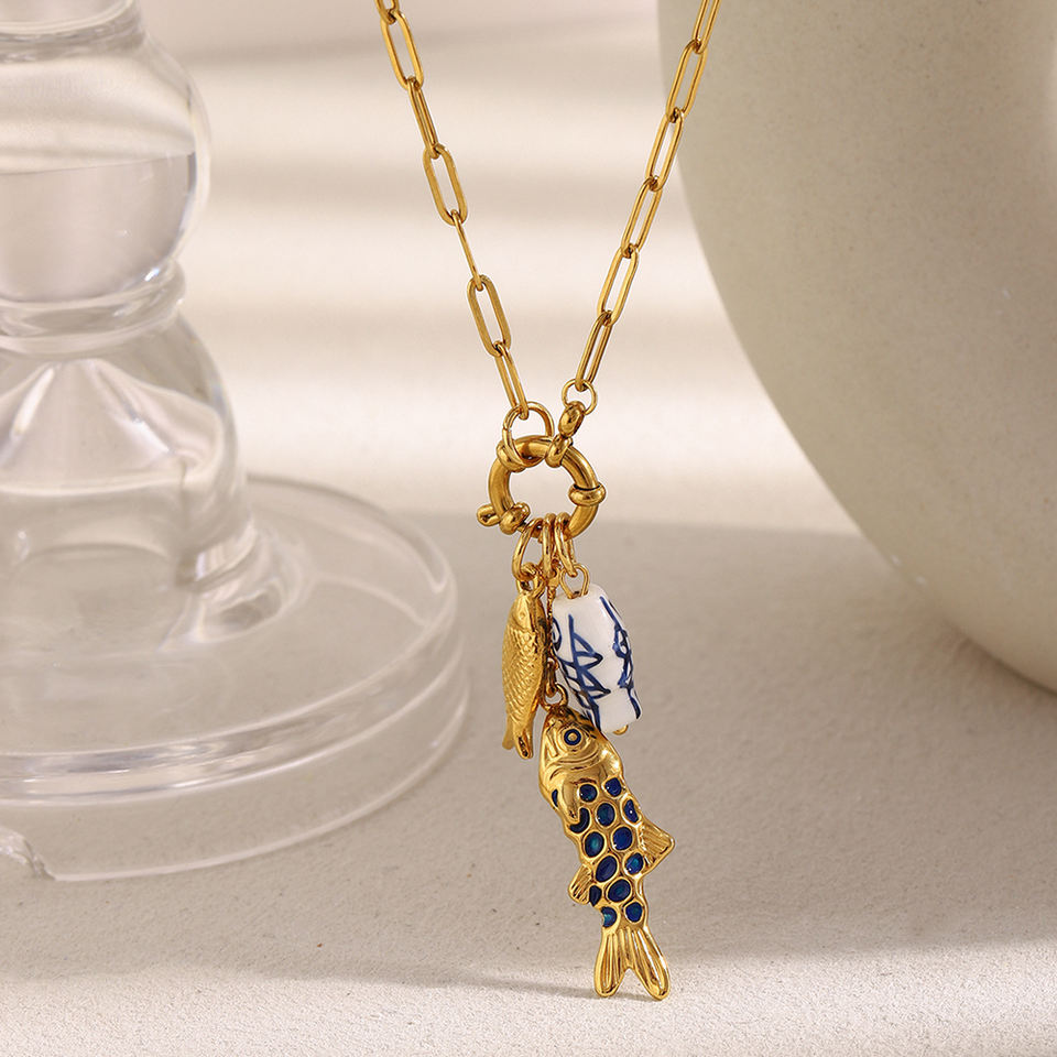 Dreamidea Gold Plated Chain Necklace with Fish - Themed Charms - Exquisite Gold and Blue - Dotted Fish Pendants