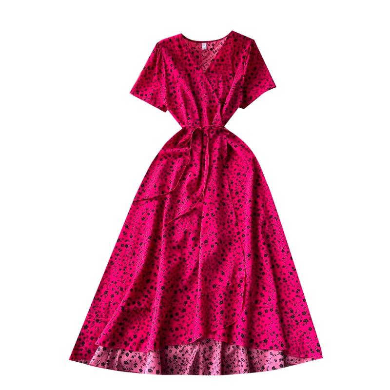 Dresses Design Sense One Piece V-neck Lace Up Waist Cinching Short Sleeved Floral Dress Women's Summer Slim French Long Vestidos