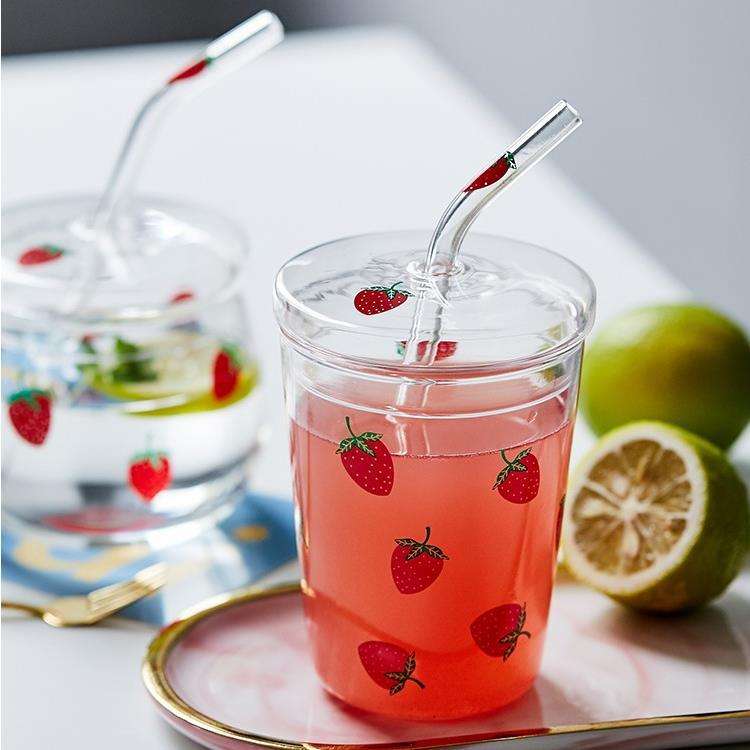 Bicchieri resistenti al calore tazze fredde tazze da caffè con coperchi e vetro moderno rotondo paglia/Tumbler con stampa fragola