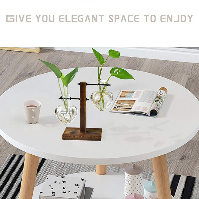 Dropshiping Hydroponic Glass Planter Heart Shaped Glass Vase With Retro Solid Wood Stand Glass Flower Pot for Home Wedding Decor