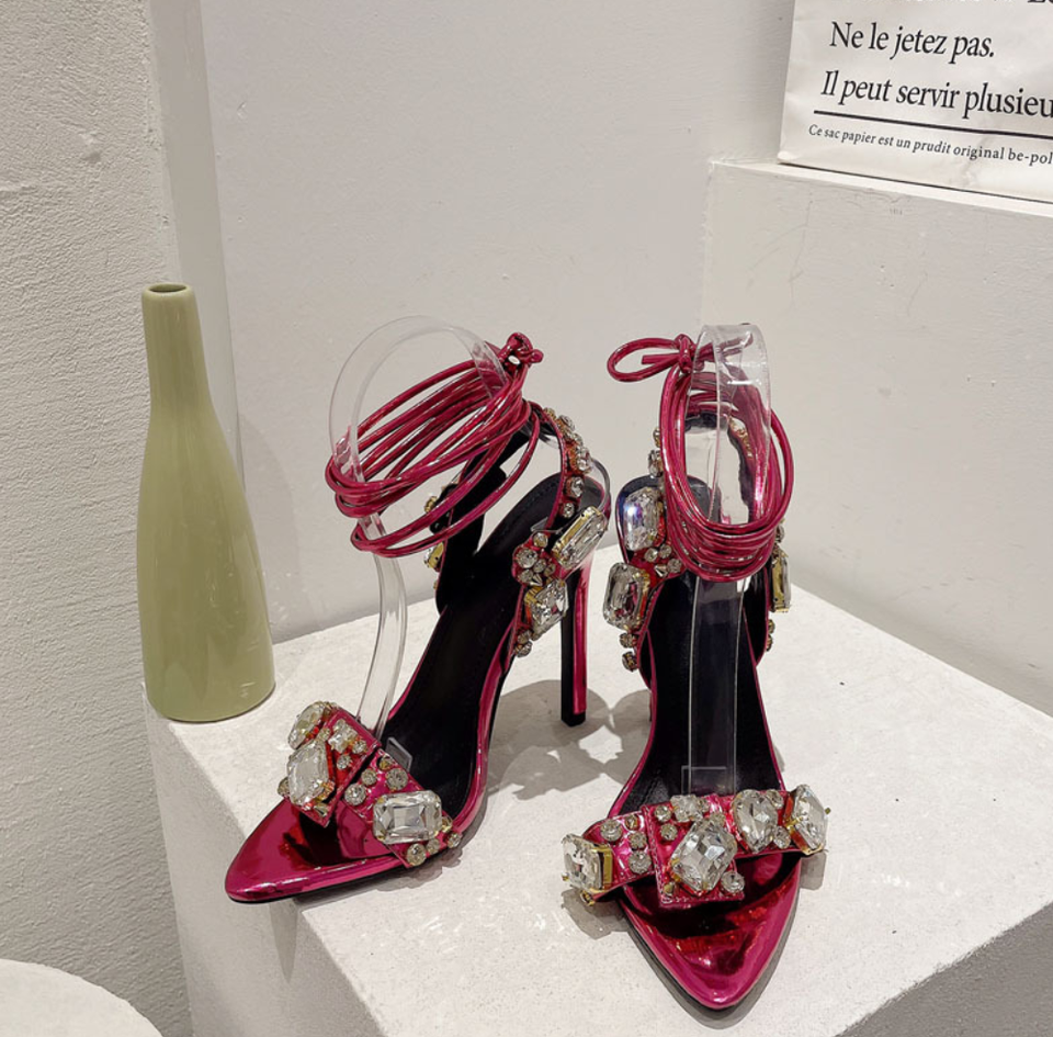 Dropshipping Logo personalizzato strass sottili tacchi alti sandali a punta da donna Sexy scarpe col tacco