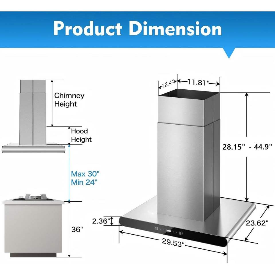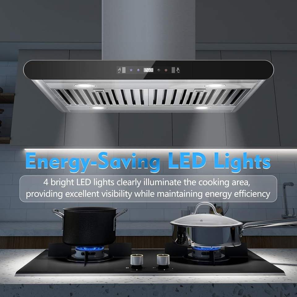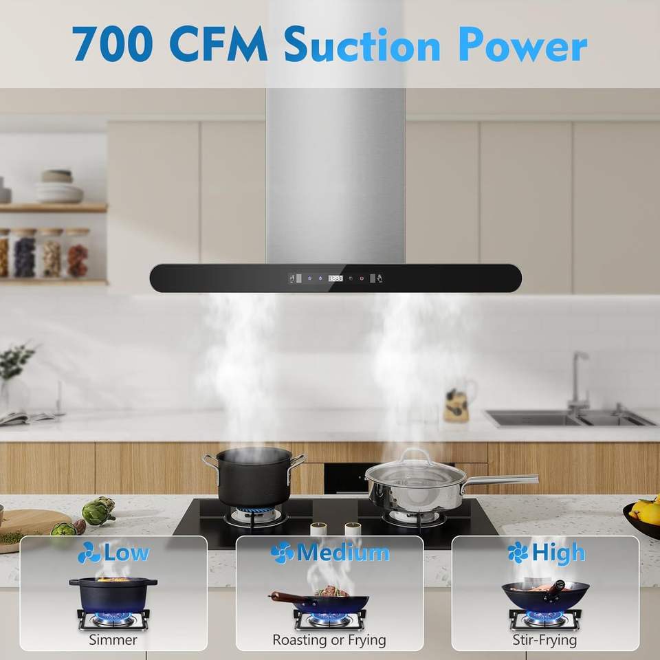 Cappa aspirante a isola bifacciale da 30/36 pollici, 700 CFM, a soffitto, convertibile canalizzata/non canalizzata, con controlli touch e gestuali