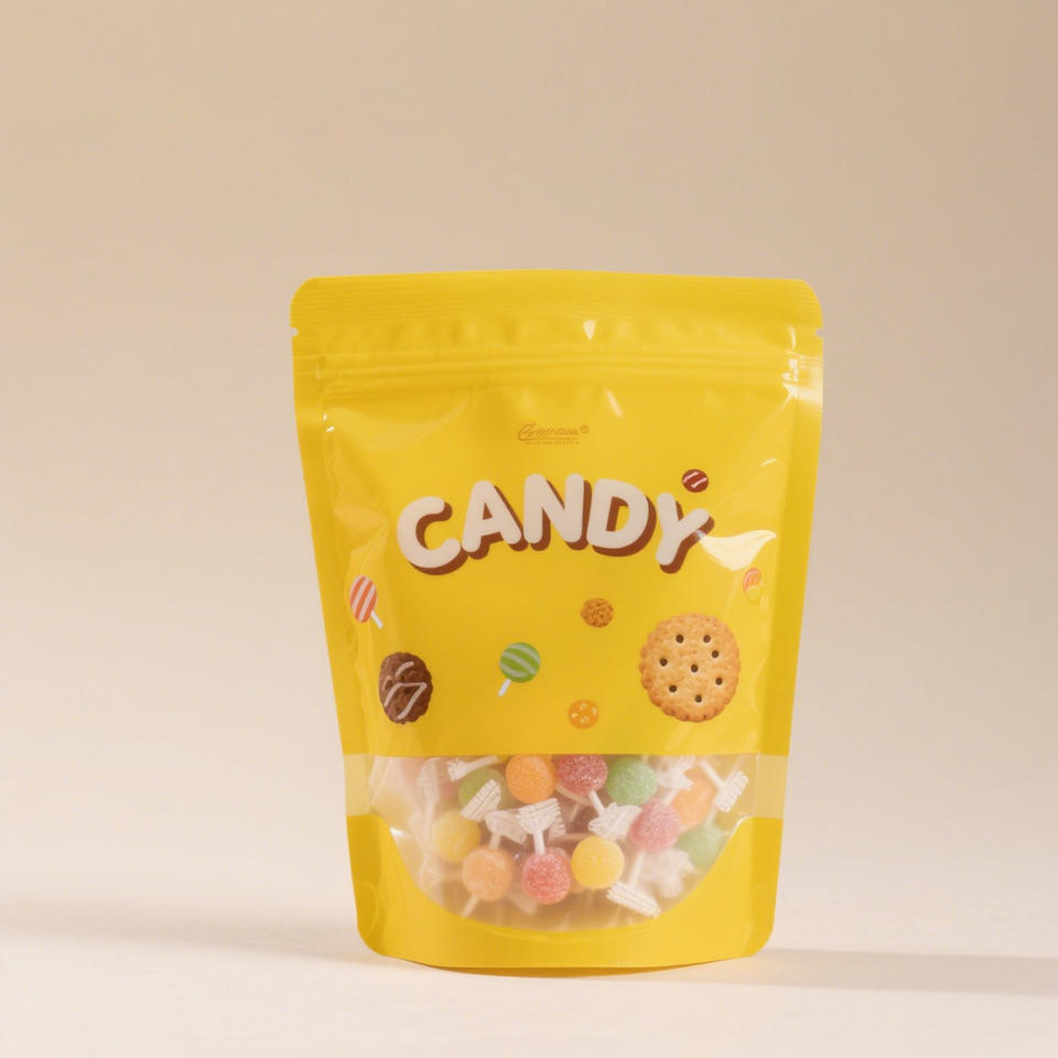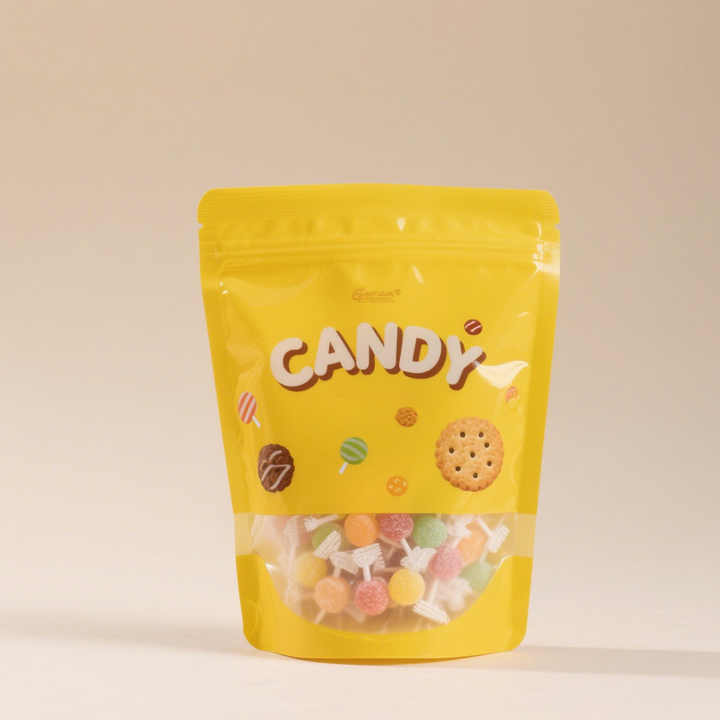 Resistente per uso alimentare Stand up custodia con cerniera per biscotti caramelle dolci giallo brillante con manico all'ingrosso sacchetti di stampa personalizzati