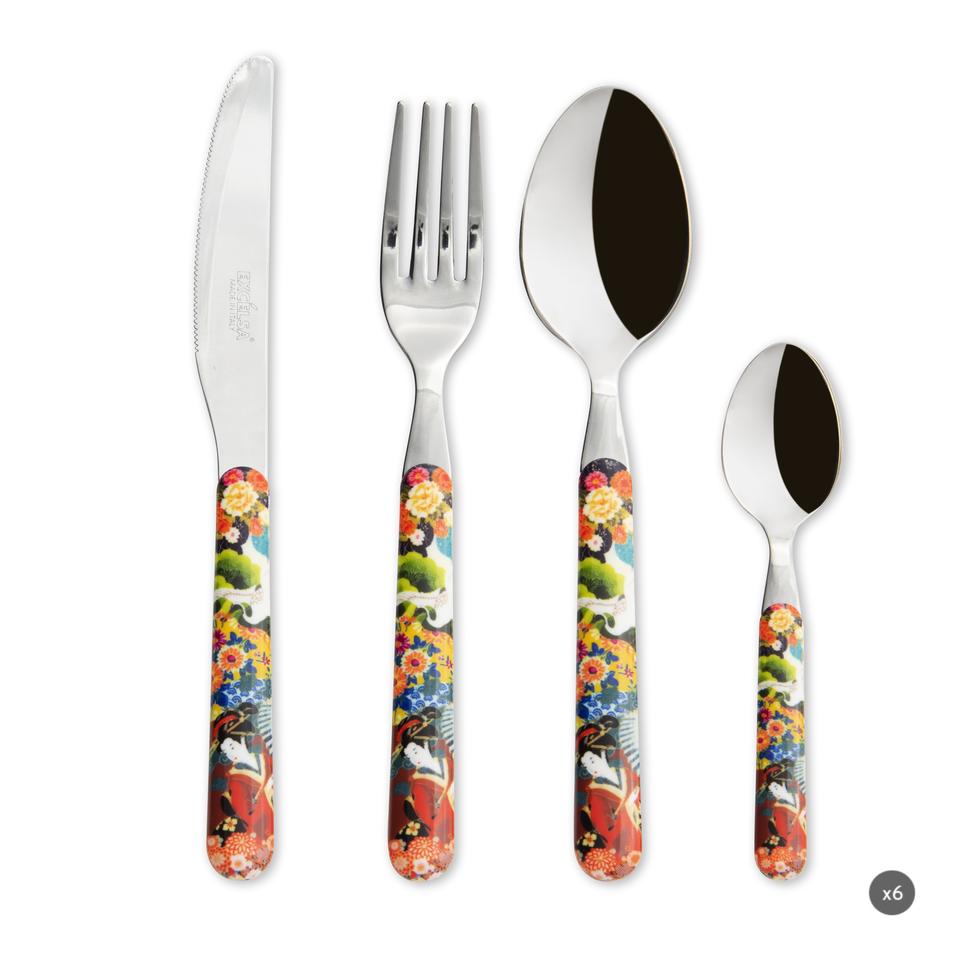 Set di posate durevoli in acciaio inossidabile da 24 pezzi, lucidatura a specchio, design orientale Geisha Kimono multicolore in stile country giapponese di Excelsa