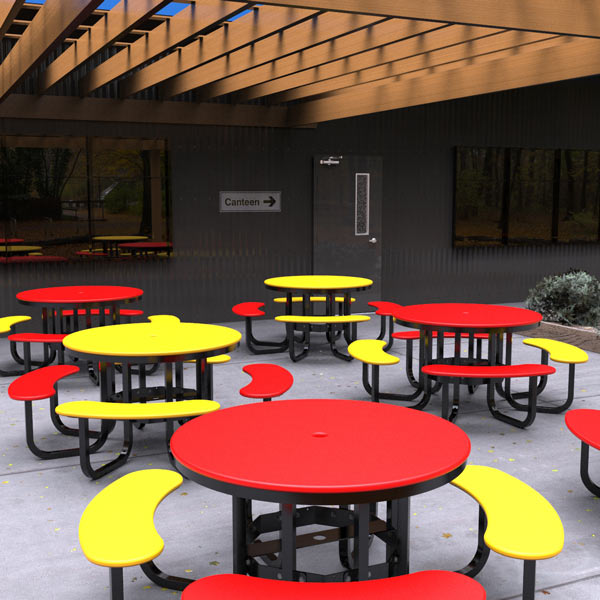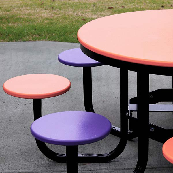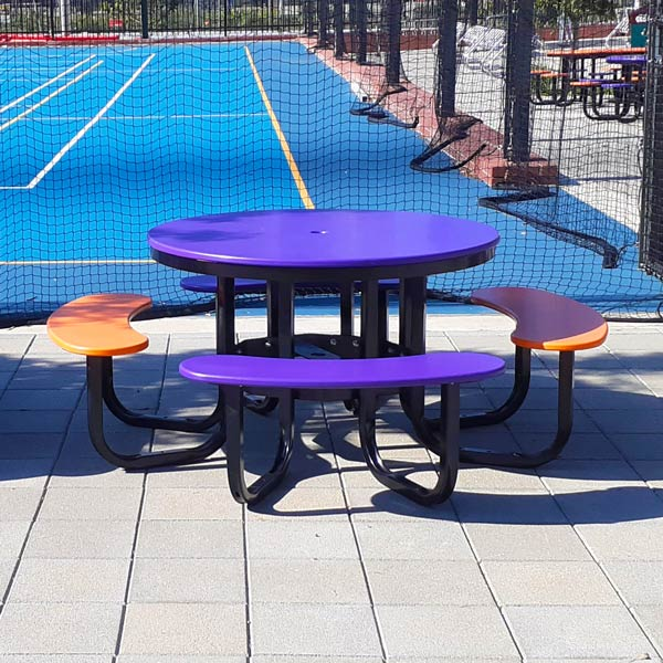 Durevole resistente agli agenti atmosferici tavolo da Picnic rotondo all'aperto con sedili in metallo colorato telaio in acciaio per parchi scuole campi da gioco