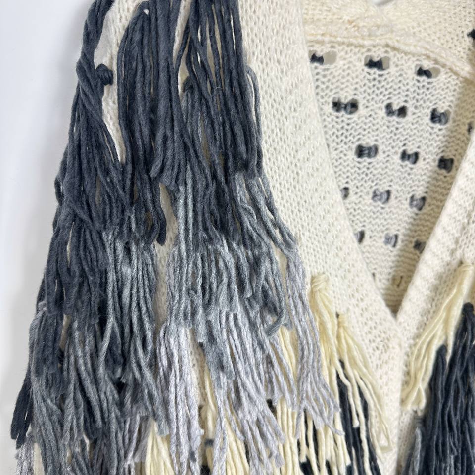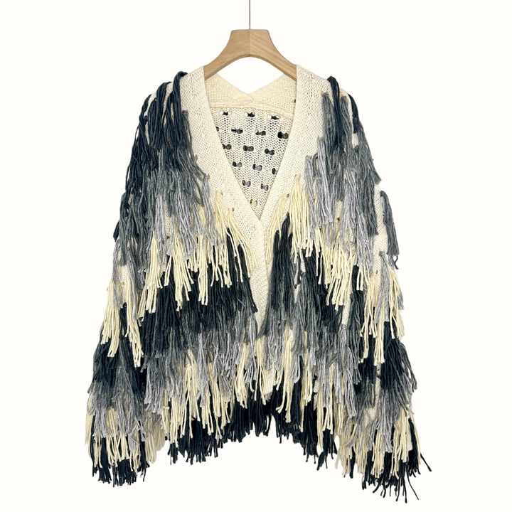 Cardigan Lungo Vintage Fatto a Mano E&L in Maglia Larga con Decorazione a Frange Sfumate in Poliestere per l'Autunno