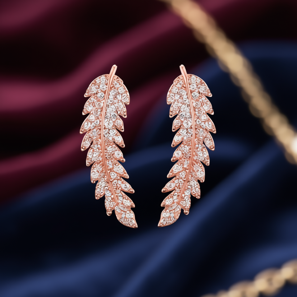 Orecchini Pendenti E125 in Oro Rosa con Piume, Cristalli e Strass, Gioielli Romantici da Donna per Uso Quotidiano
