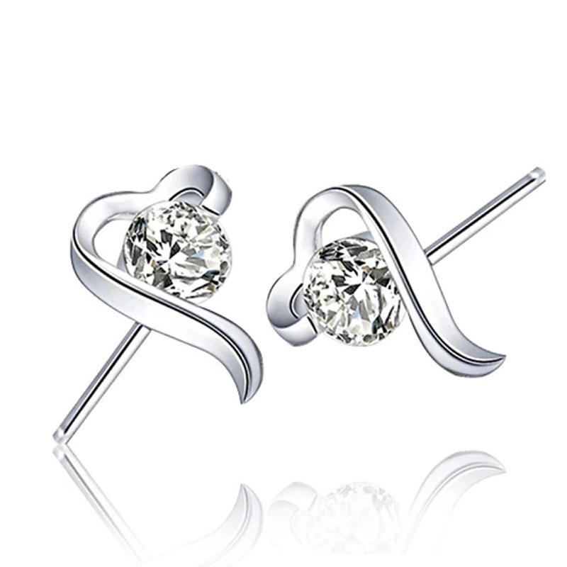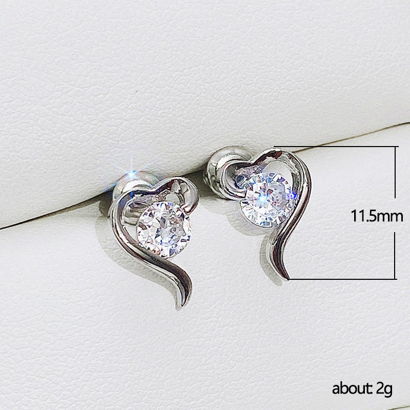 E1258 White Gold Heart Stud Earrings With Round Zircon Claw Setting For Women Romantic Gift Fashion Jewelry