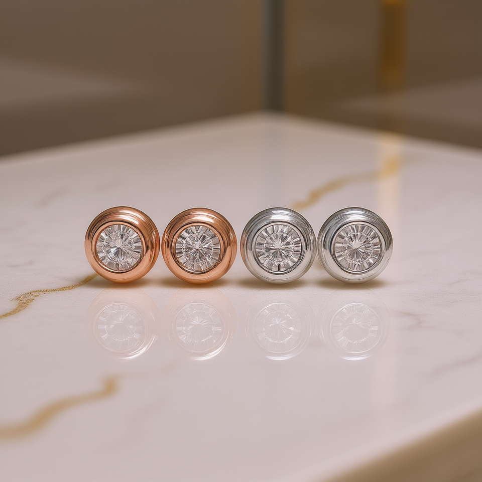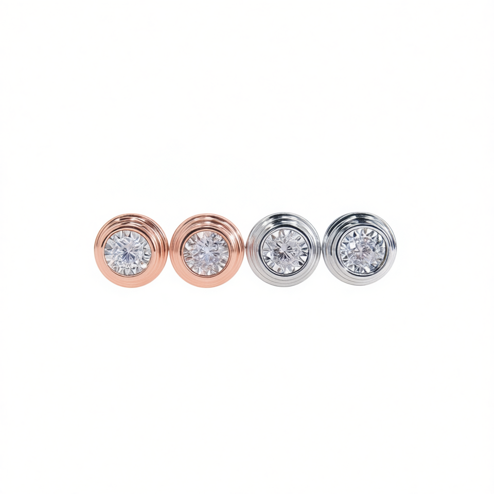 E1286 Rose Gold Stud Earrings Round Brilliant Cut Diamond Bezel Setting Classic Unisex Everyday Wear