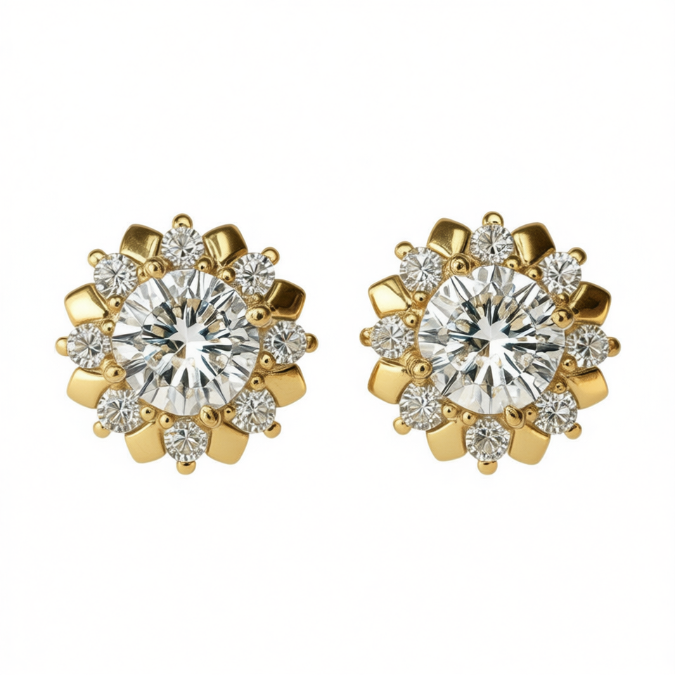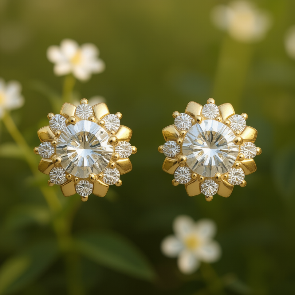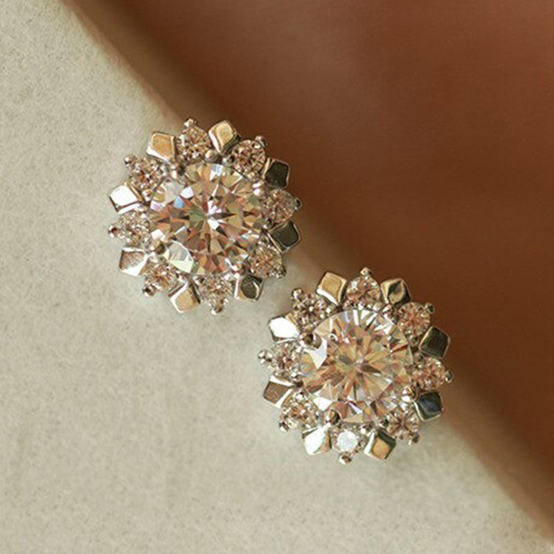 E1412 Diamond Stud Earrings Gold Plated Flower Design Round Brilliant Cut Classic Women's Wedding Jewelry