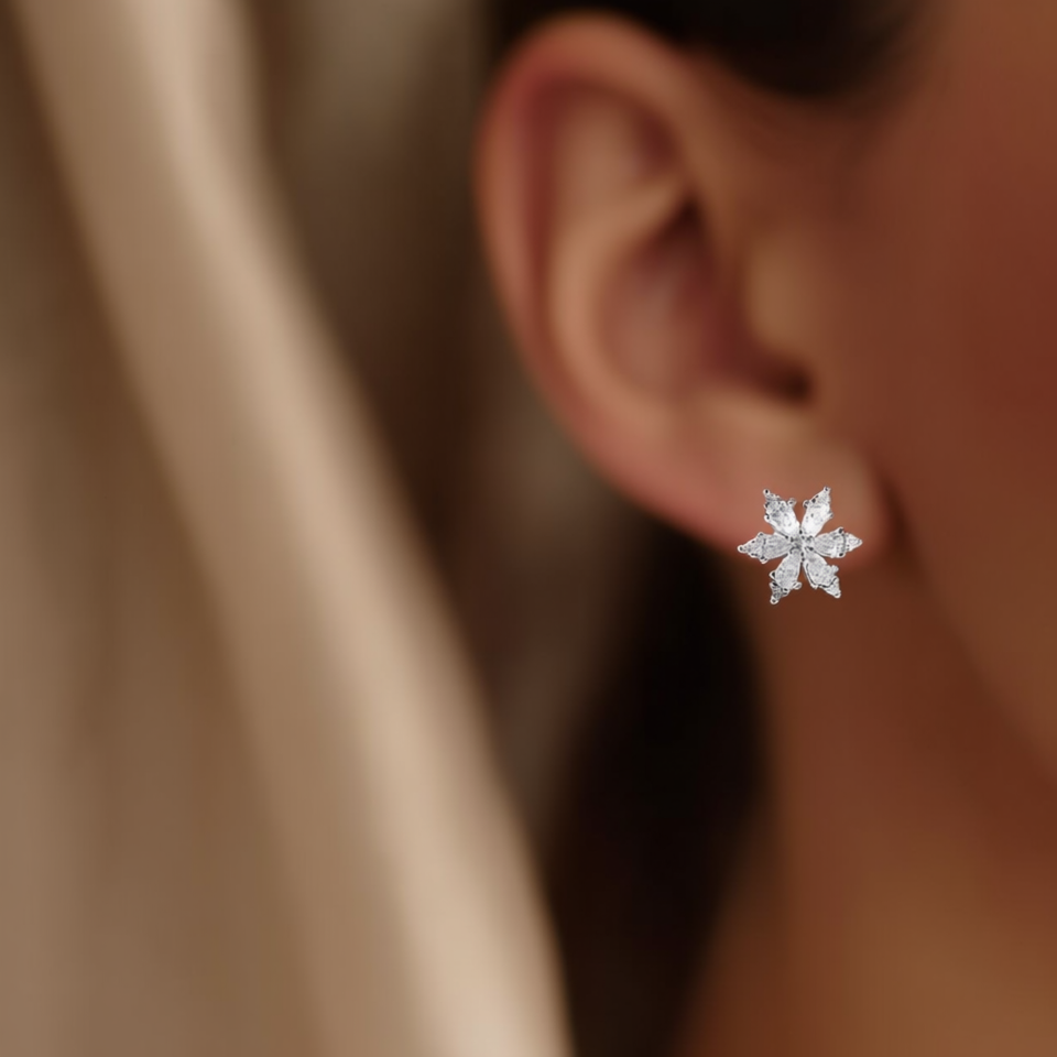 Orecchini a Perno E1486 a Forma di Fiocco di Neve in Oro Bianco con Cristalli Taglio Marquise e Strass, Gioielli di Moda per Donne