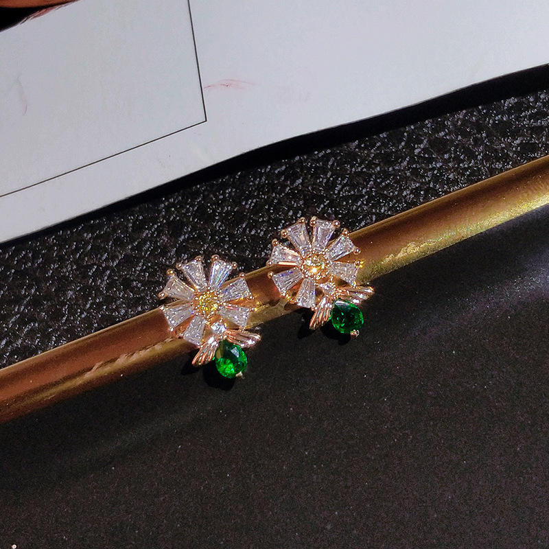 Orecchini Pendenti E1506 con Fiore Dorato e Zirconi Taglio Smeraldo, Gioielli Classici da Festa per Donne