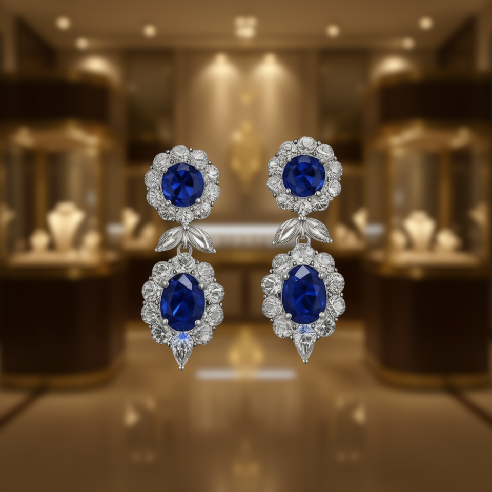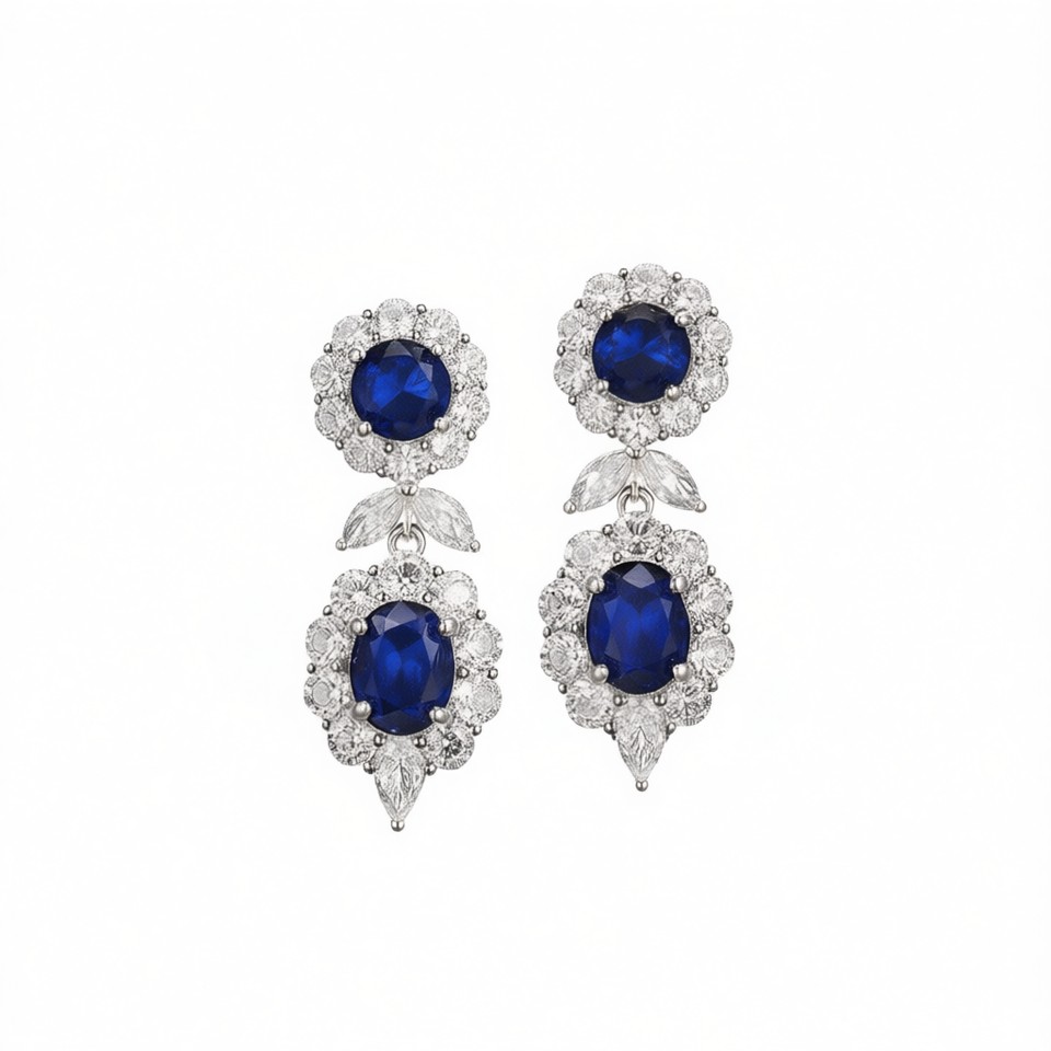 E1552 Sapphire Blue Drop Earrings Women's Flower Design Round Brilliant Cut Diamond Alloy Jewelry Party Style