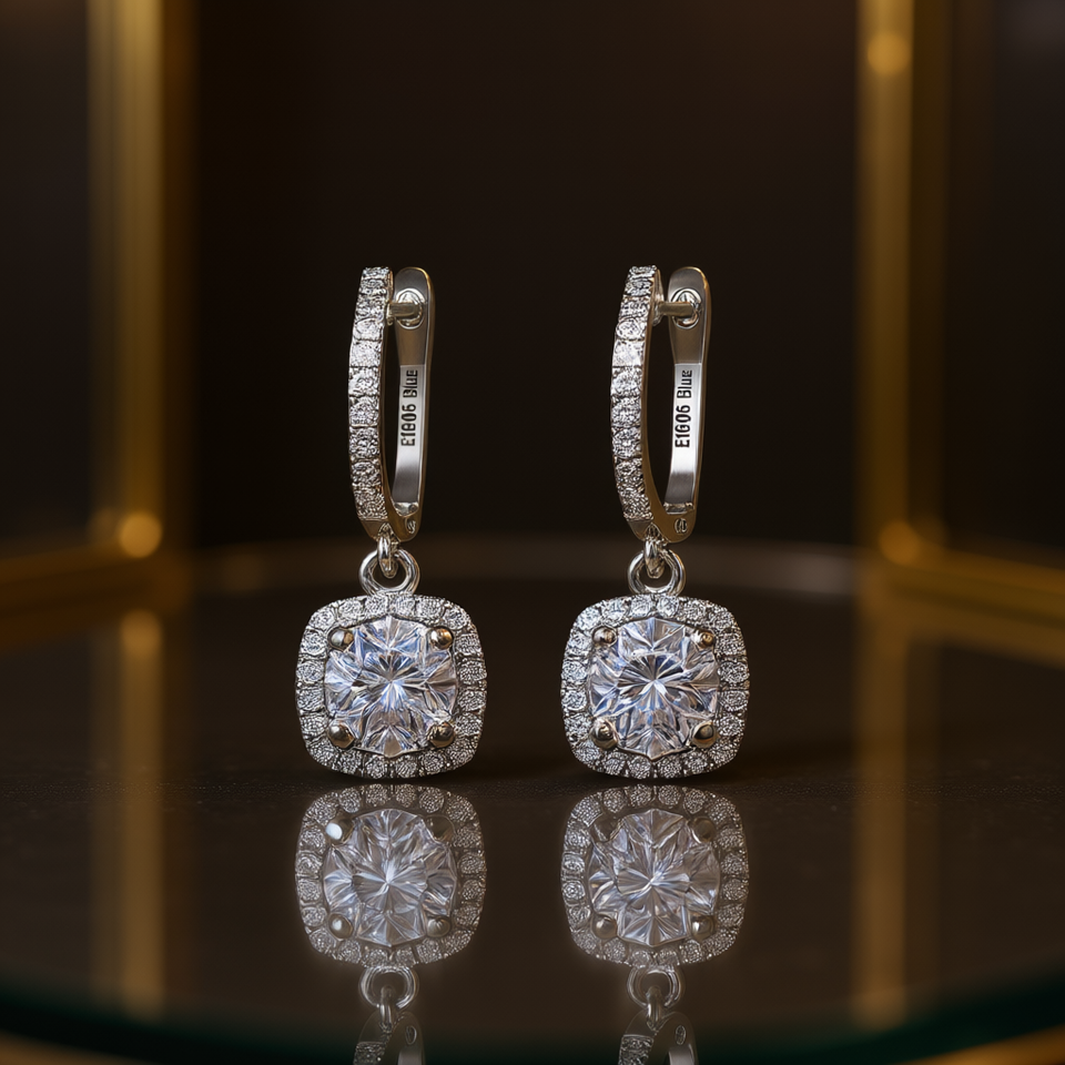 E1606 Blue Diamond Earrings White Gold Round Brilliant Cut Women's Wedding Classic Style