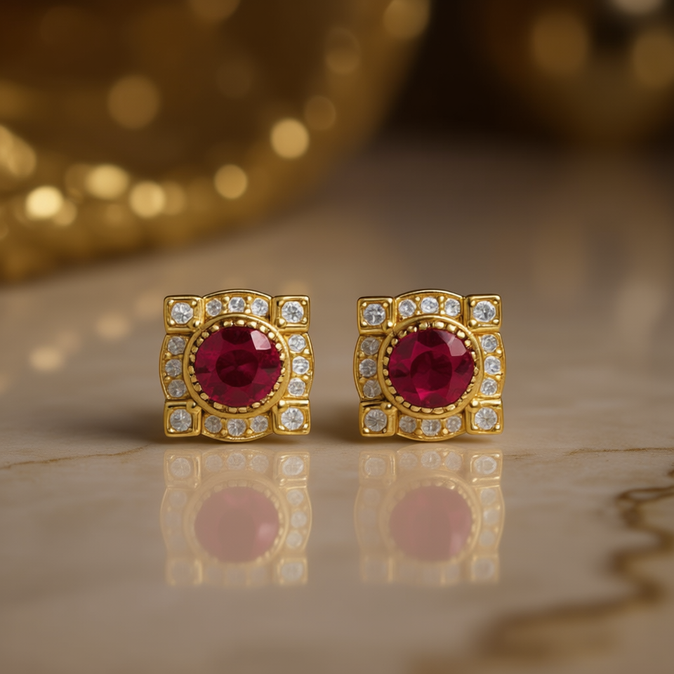 E1658 Gold Ruby Stud Earrings With Diamond Halo Bezel Setting Classic Geometric Design Women's Fine Jewelry