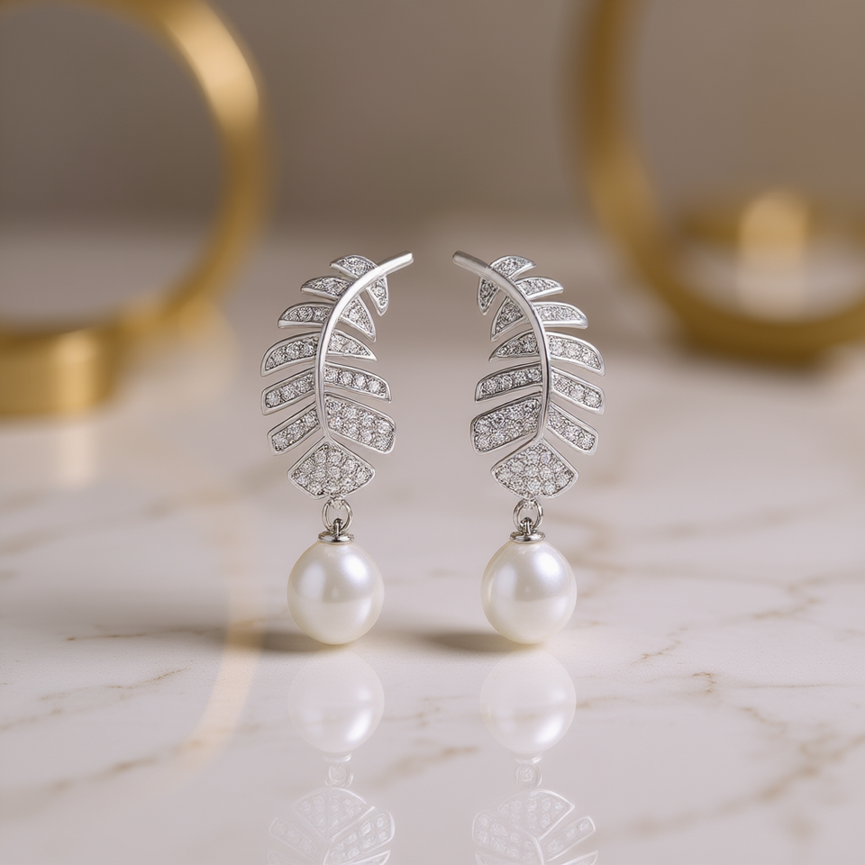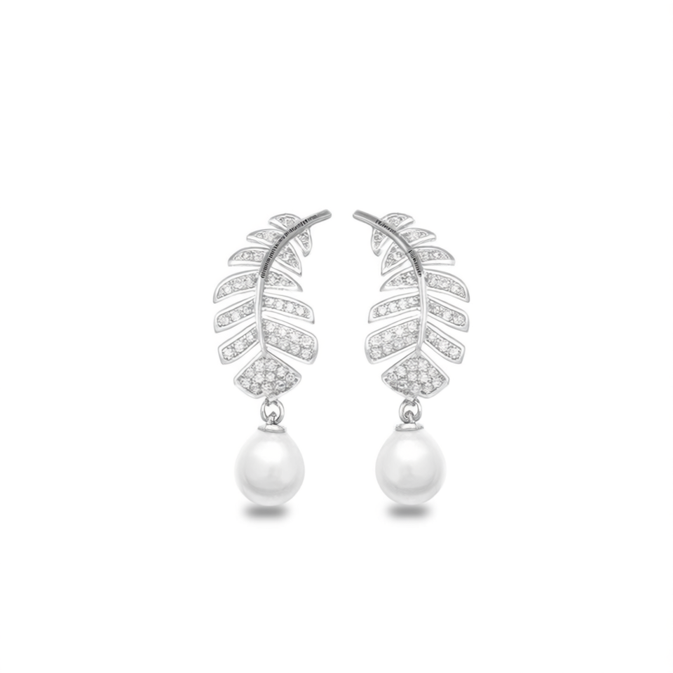E1760 White Gold Feather Drop Earrings With Imitation Pearl And Round Brilliant Cut Diamonds For Wedding Women's Romantic Style