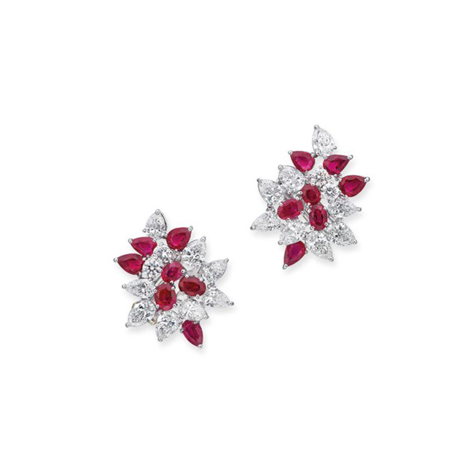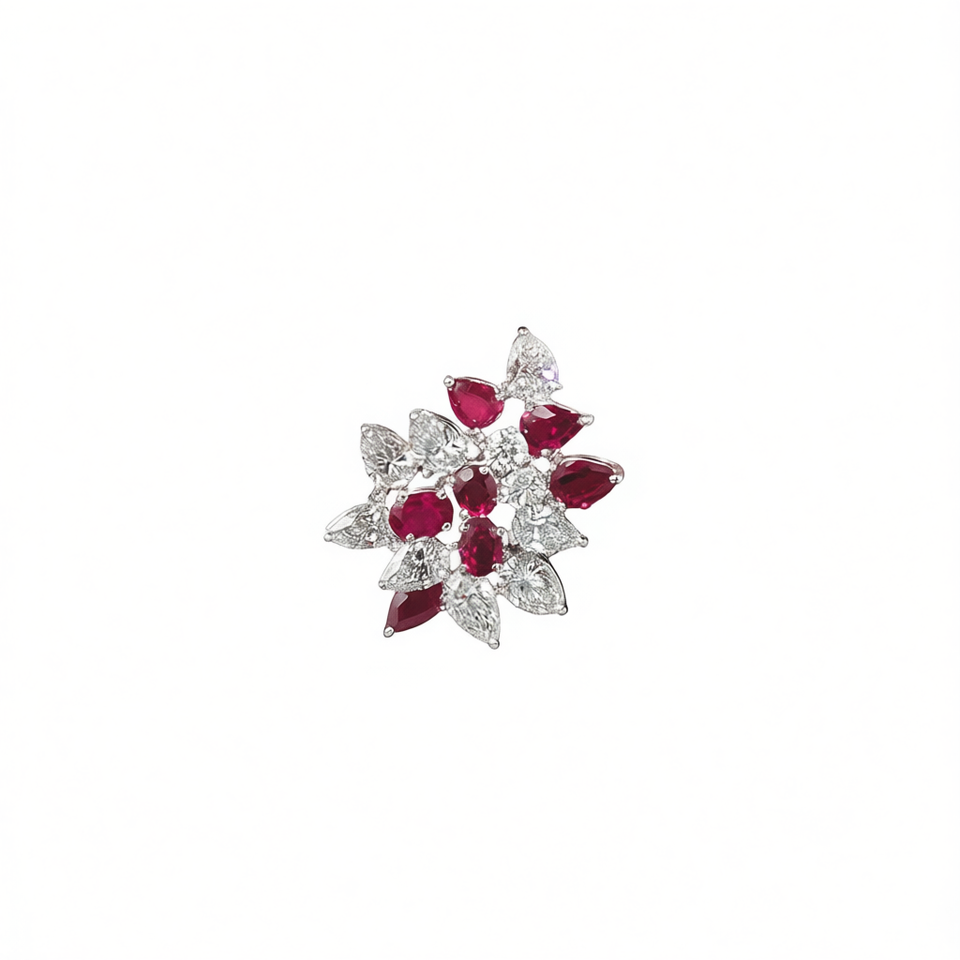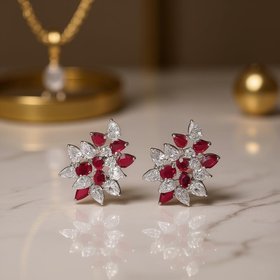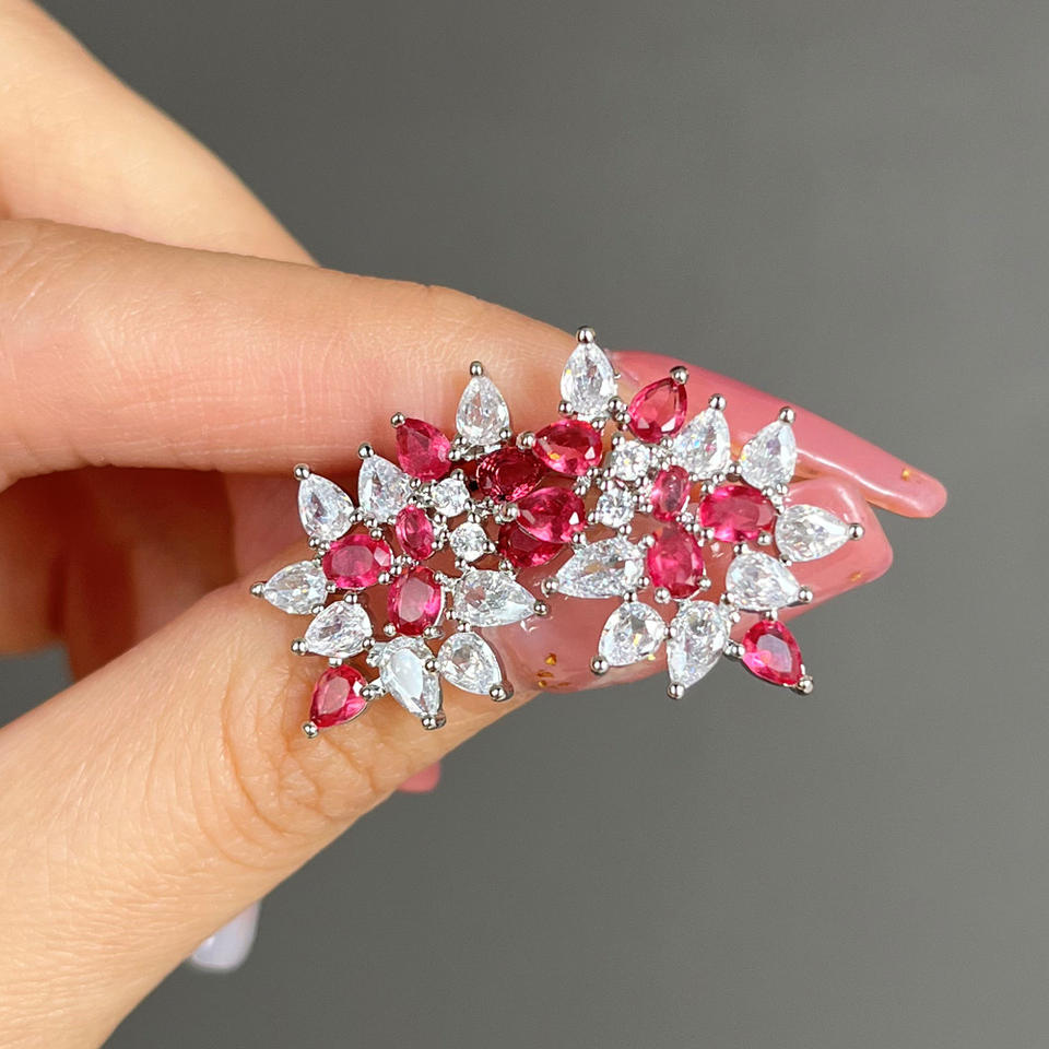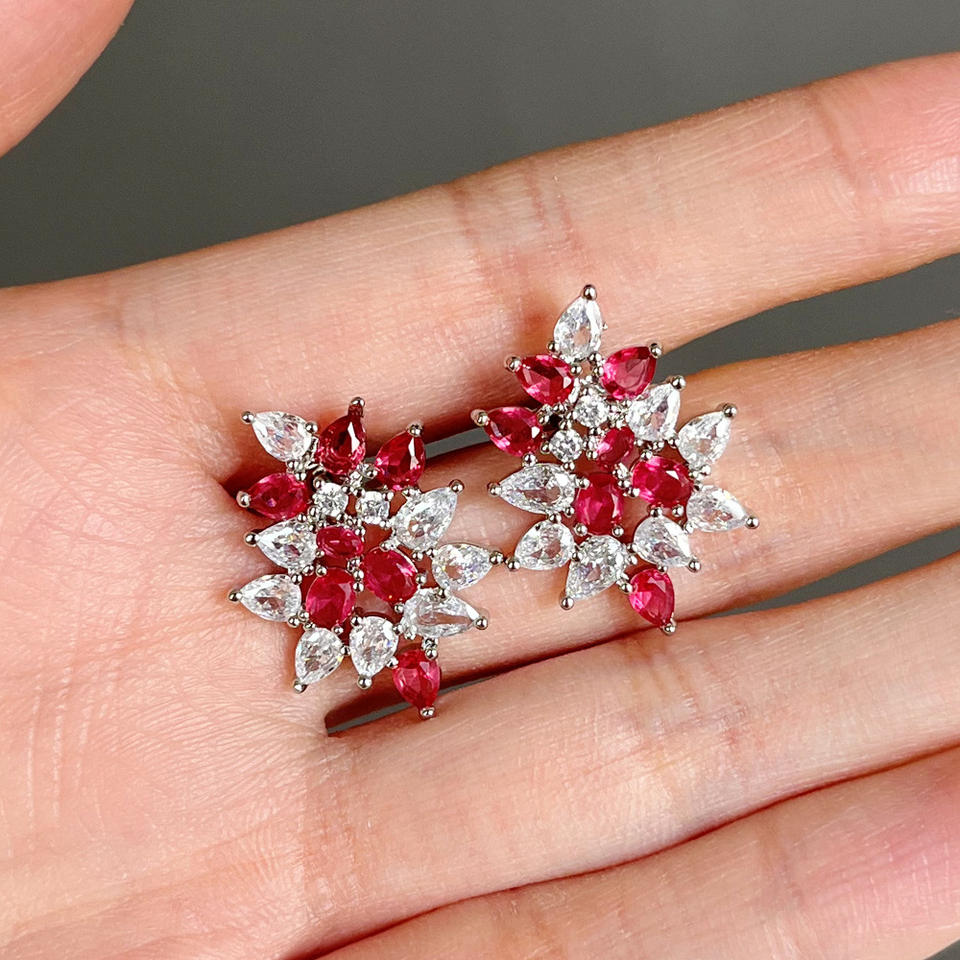 Orecchini a lobo E1912 in oro bianco con rubino a forma di fiore, montatura a griffe, gioielli di lusso da donna per matrimonio