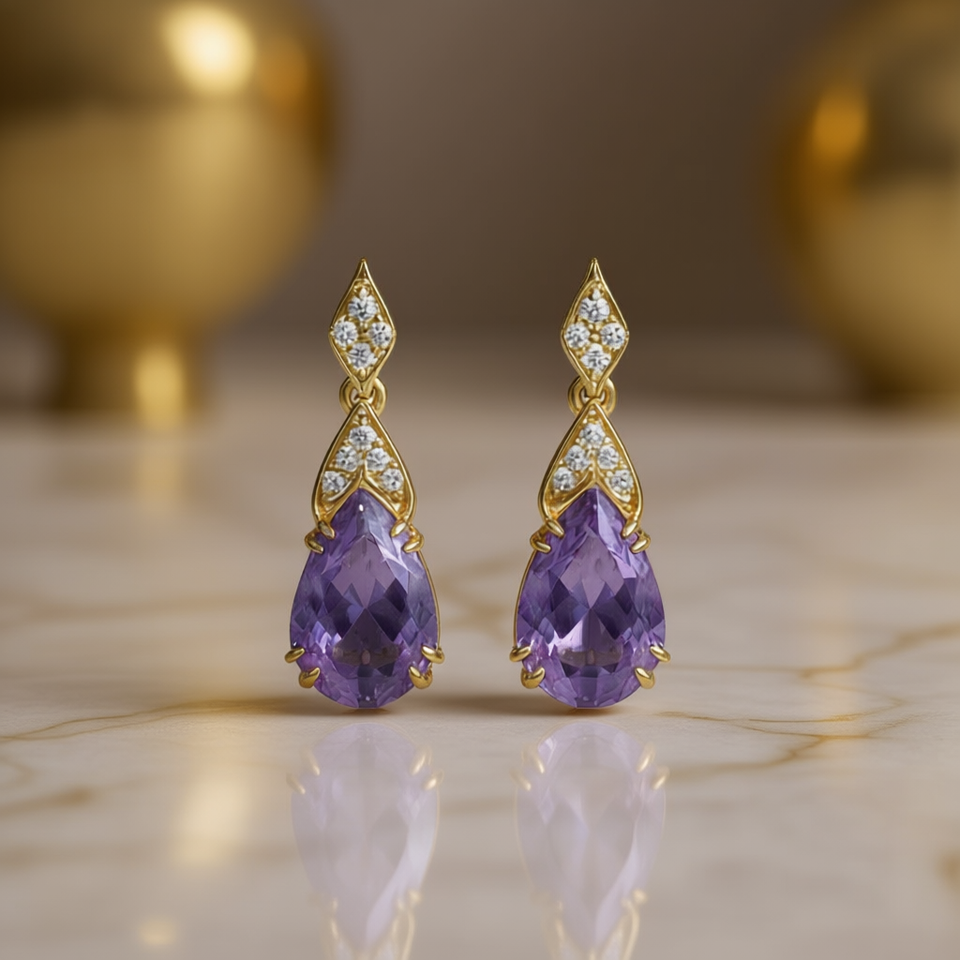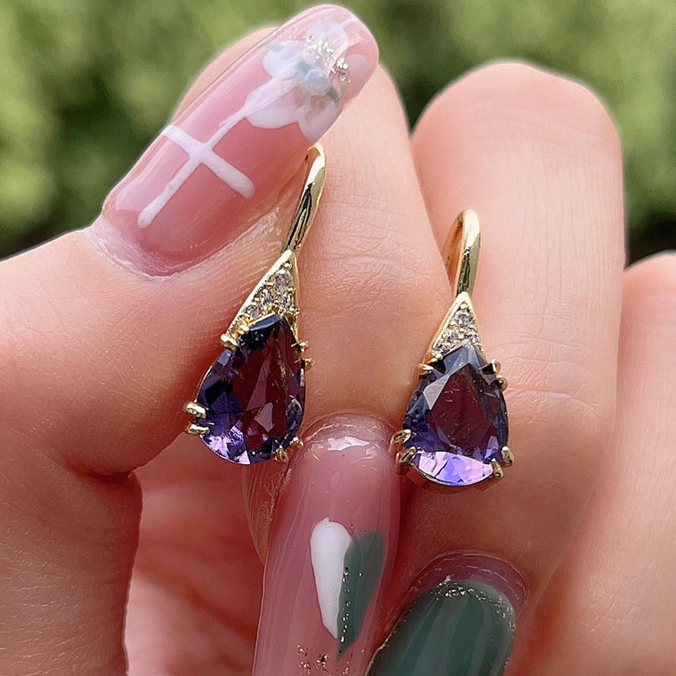 E1924 Purple Diamond Earrings 18K Solid Gold Amethyst Pear Cut Women's Classic Party Jewelry
