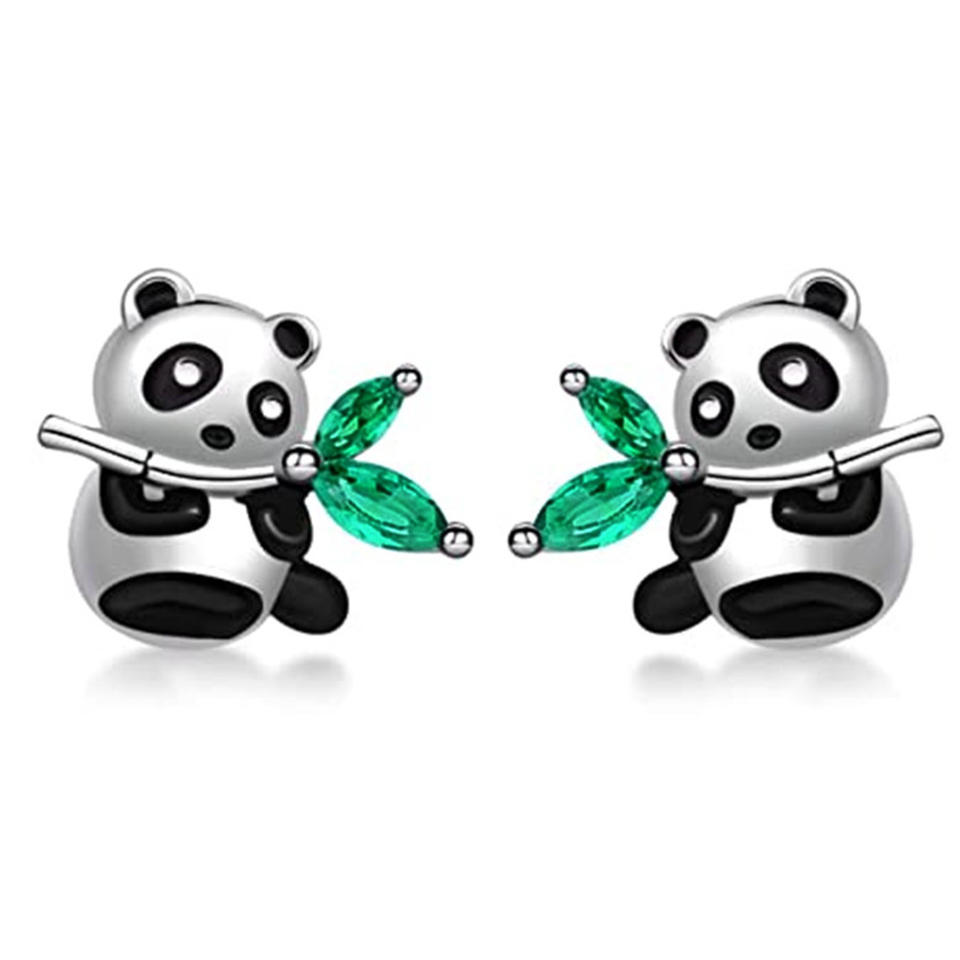E1945 White Gold Panda Stud Earrings With Green Gemstone Emerald Cut Cartoon Design Unisex Gift Jewelry