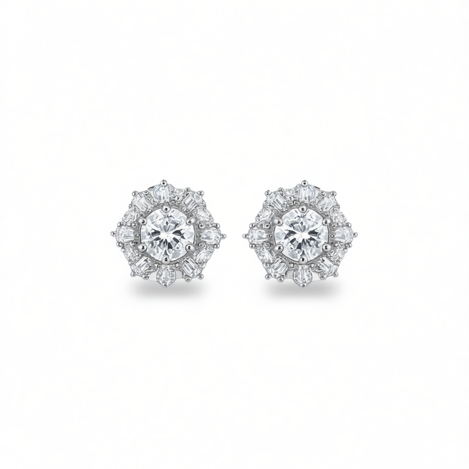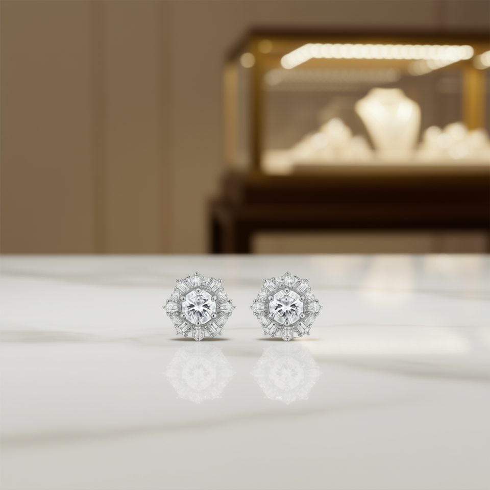 E208 White Gold Stud Earrings Round Brilliant Cut Diamond Flower Design Claw Setting Women's Wedding Classic Jewelry
