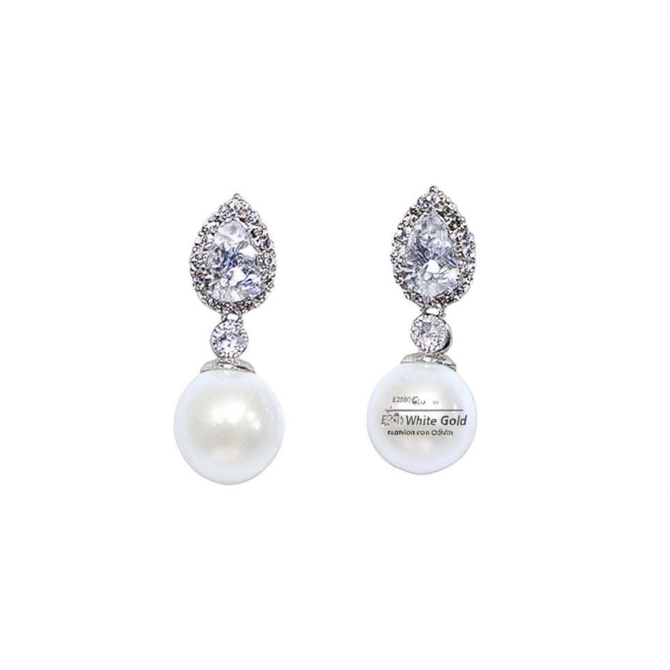 Orecchini pendenti in oro bianco E2080 con diamante taglio marquise e perla imitazione per donna, stile classico da matrimonio