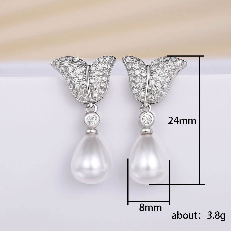 E2163 White Gold Butterfly Drop Earrings With Faux Pearl AAA Round Silver Plated Classic Women's Wedding Jewelry