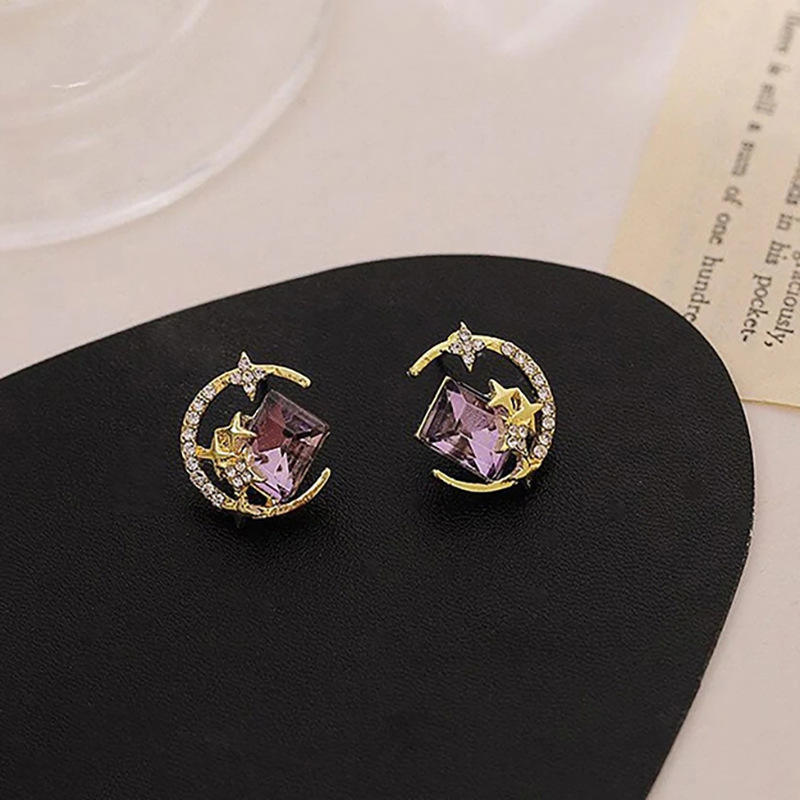 E2340 Gold Stud Earrings With Purple Crystal Star Moon Design For Women Everyday Wear Cute Fashion Jewelry